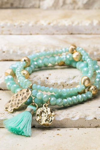 Mint Tassel & Charm Beaded Bracelet Set