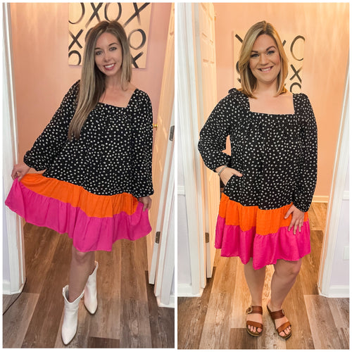 Color Block Black & White Floral Print With Pink & Orange Ruffle Tiered Long Sleeve Oversized Dress (Sizes: S-3XL)
