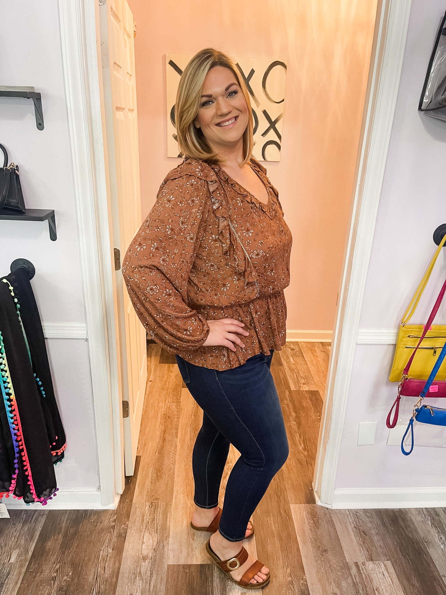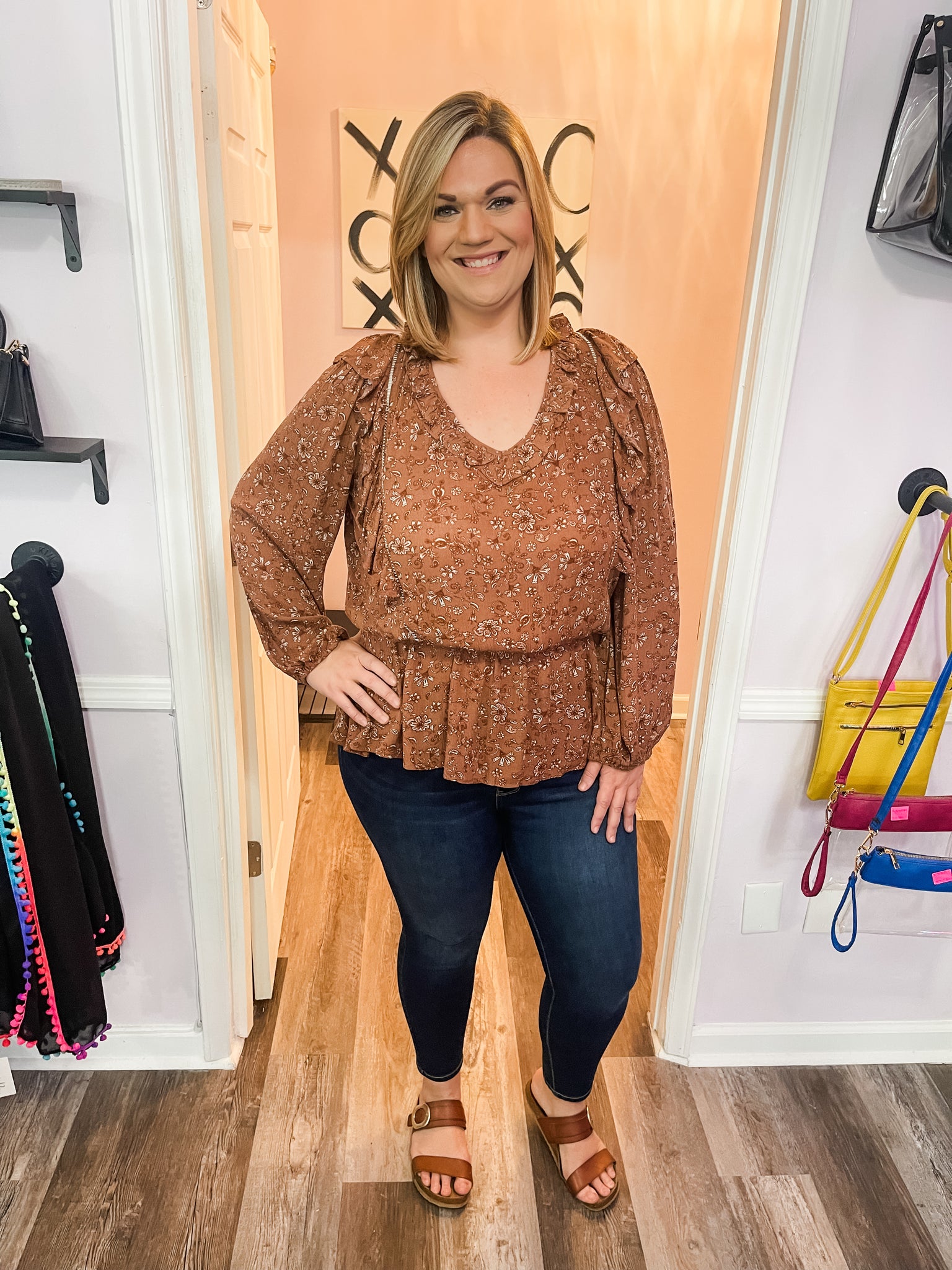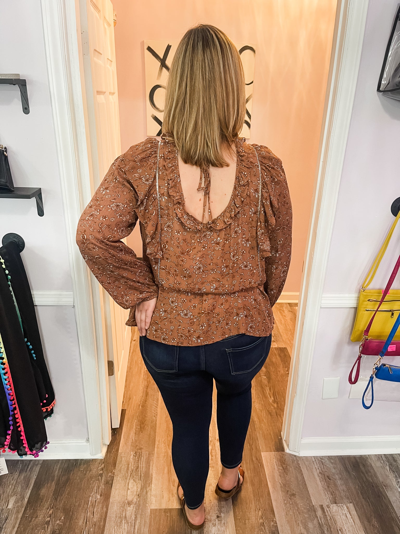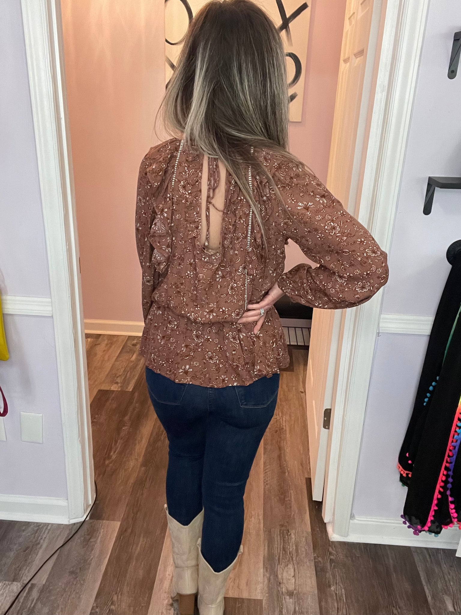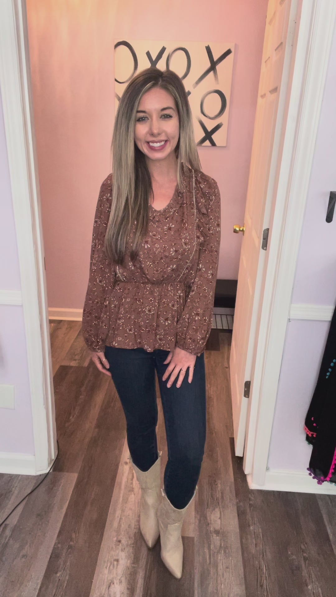 Perfect Fall top! Feel girly and flirty in this antique brown dark mauve floral print ruffled long sleeve top. Wear to work, out with friends, on a date, etc! NO amount of stretch EXCEPT for the stretchy wrist bands and waist band. Self tie in the back. True to size.