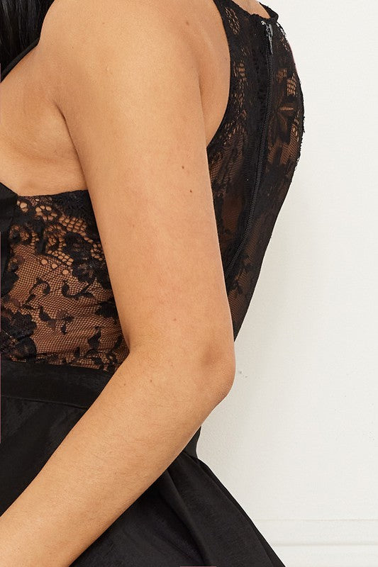 Feel sweet and sassy in this black a line spaghetti strap lace backing dress. Wear to an invent, out with friends, or on a date! Good amount of stretch. Zippered back. True to size.