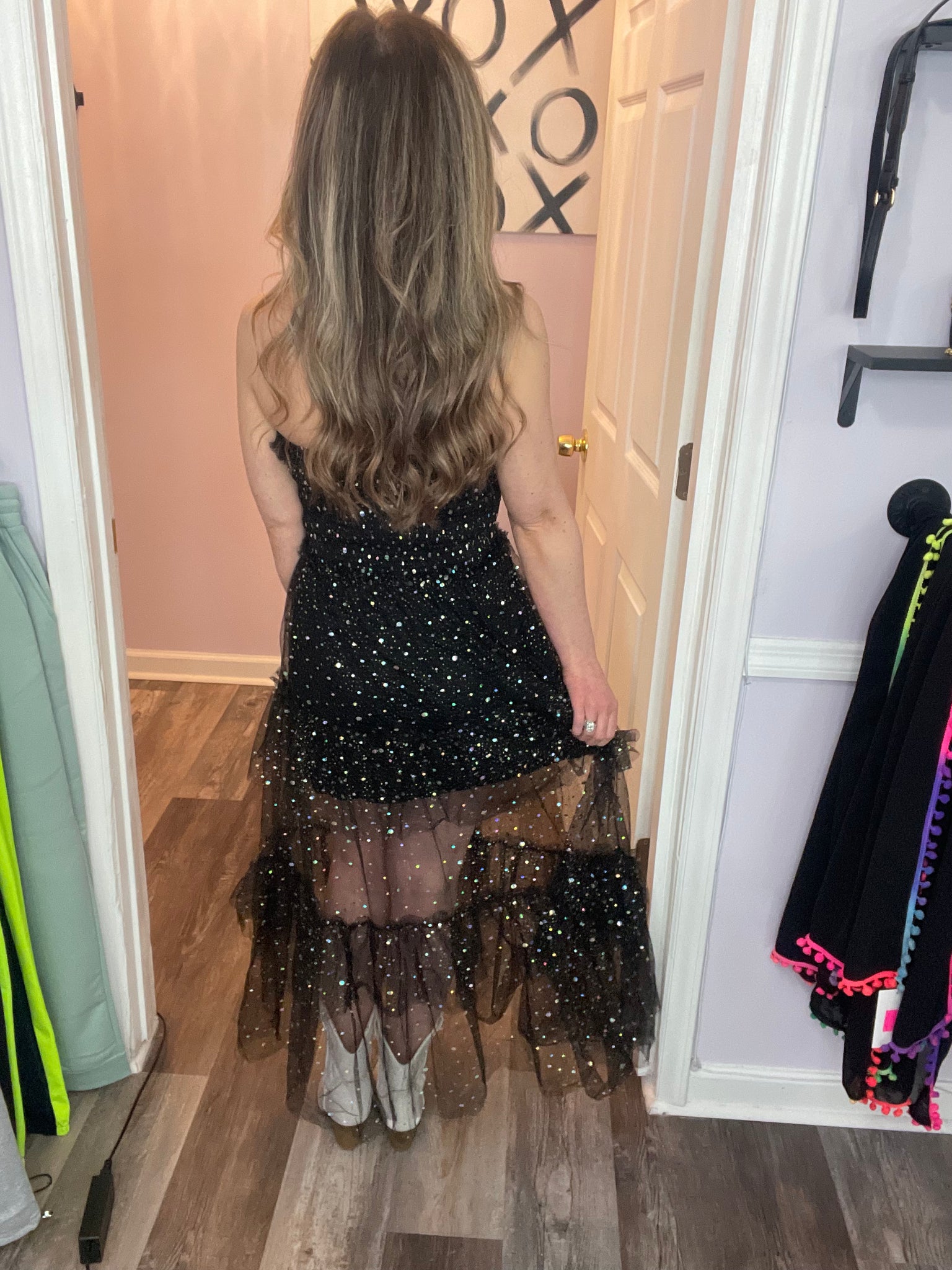 Feel classy and sassy in this black & multi-colored sequin tiered maxi dress. Wear out with friends, on a date, to an event etc! Good amount of stretch. Dress is lined.