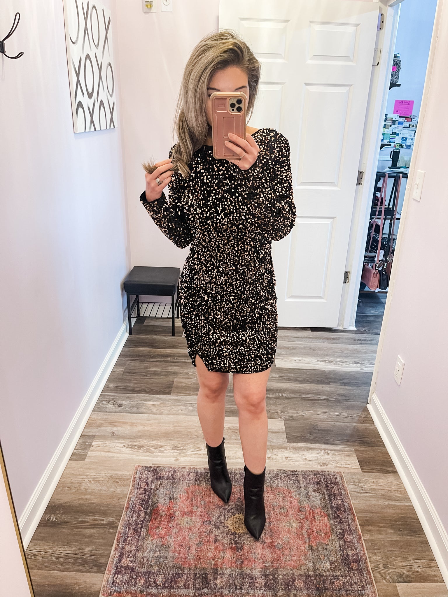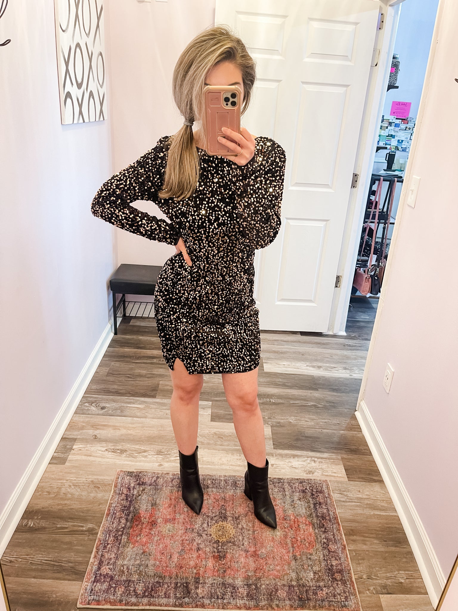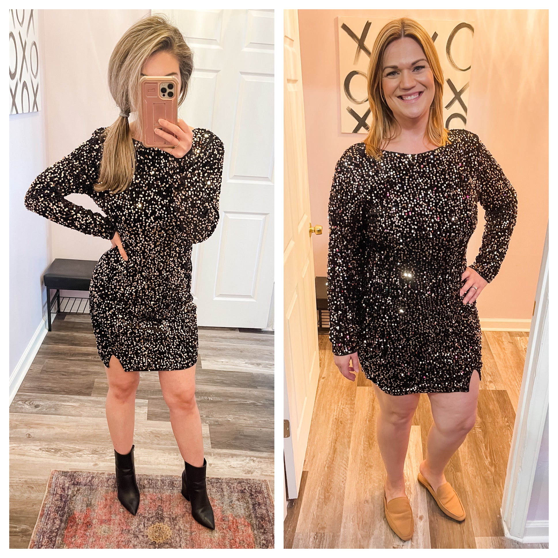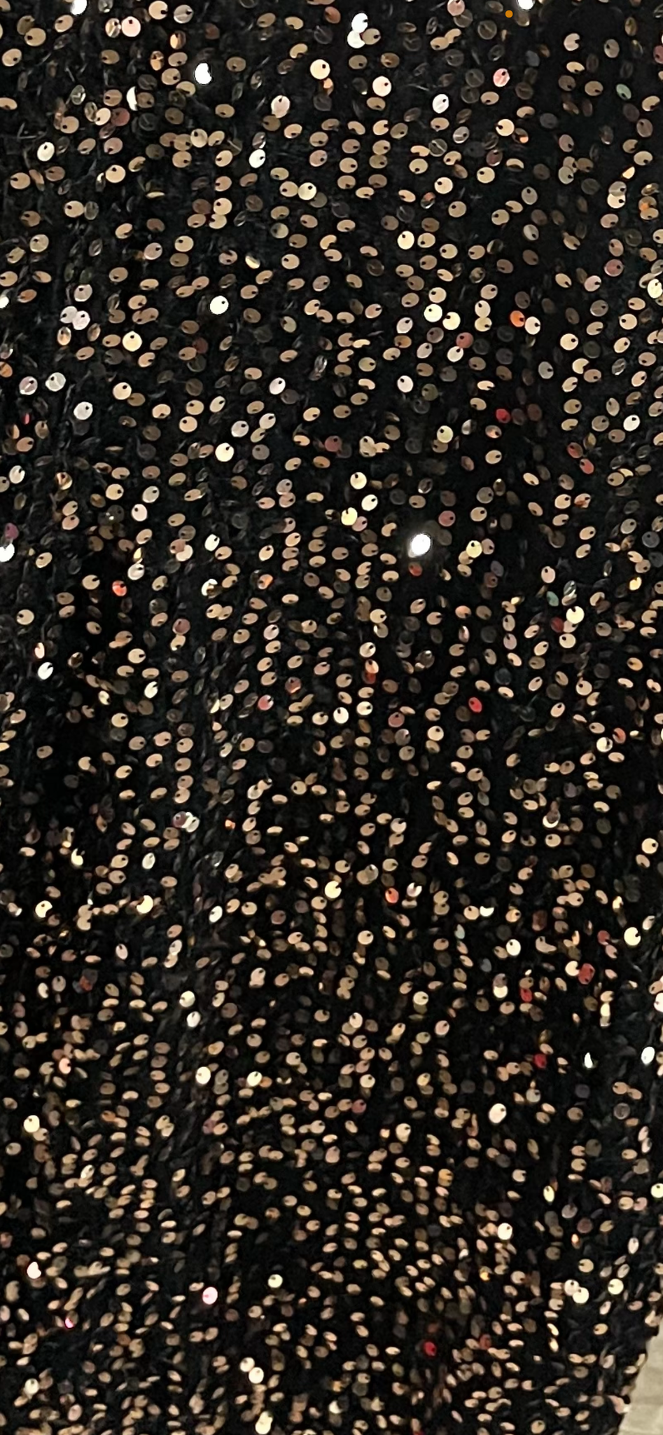 Feel cute and stylish in this black velvet like & dark golden brown sequin slit dress! Dress it up or down. Wear to a work party, birthday bash, out with friends, or on a Holiday! Completely lined! Back has zipper and a self tie! Some stretch. True to size.