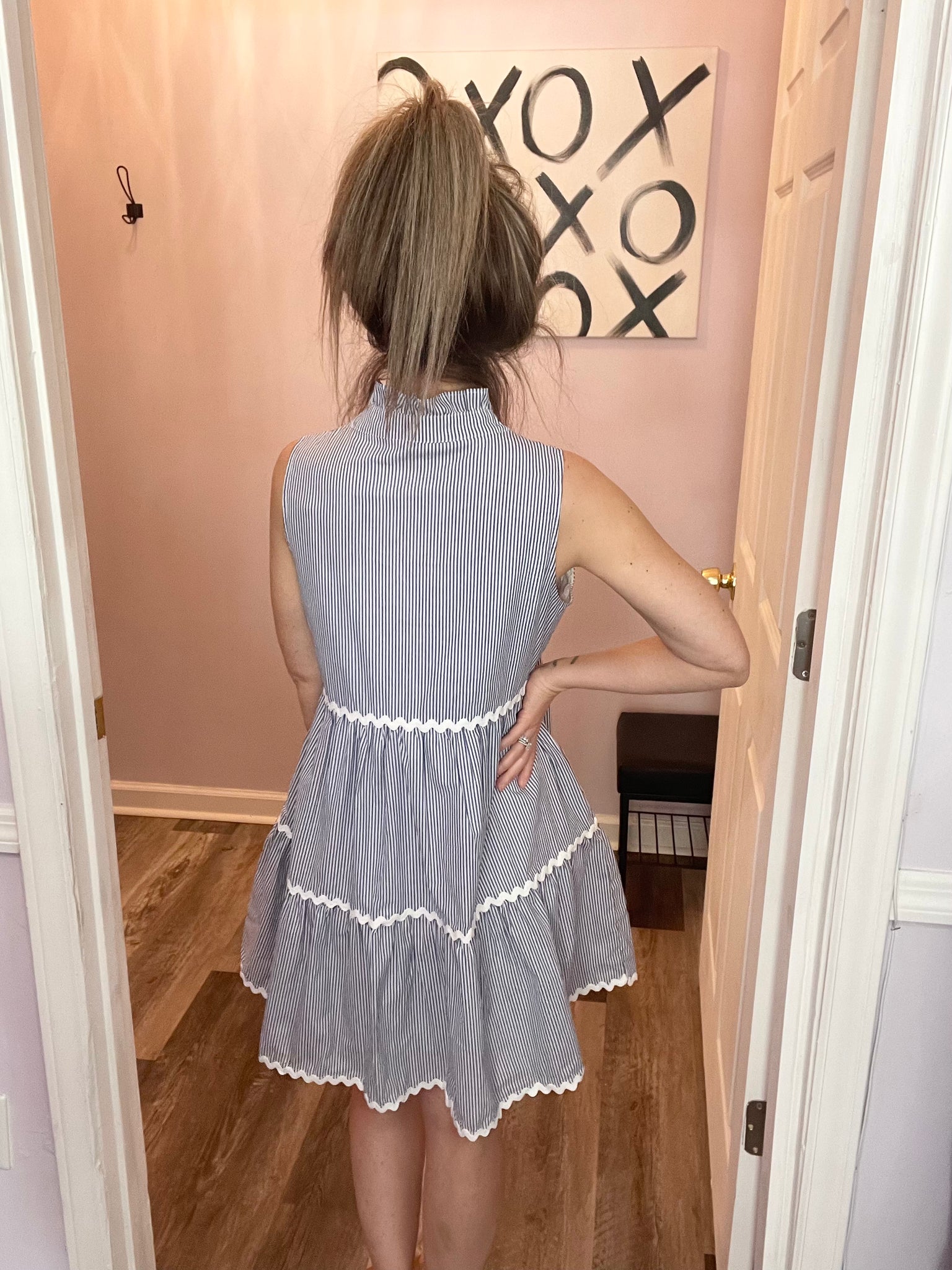 Feel cute and girly in this blue seersucker inspired with white ric rac trim dress! Dress it up or down. Wear to work, out with friends, or on a date! No amount of stretch. True to size.