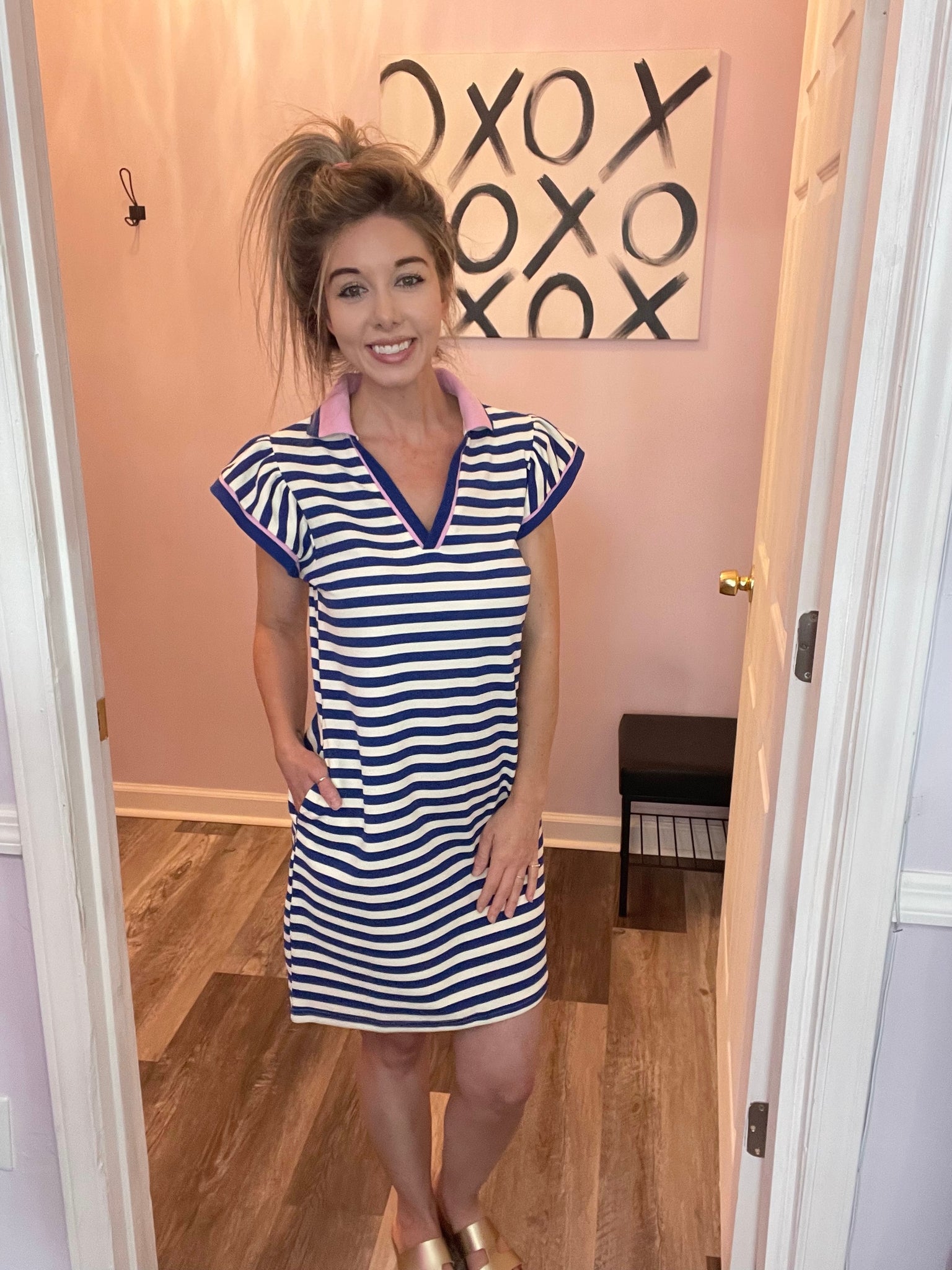 Feel comfy and girly in this blue and white striped with pink lining v neck dress! Dress it up or down. Wear to work, out with friends, running errands, or on a date! Good amount of stretch. True to size.
