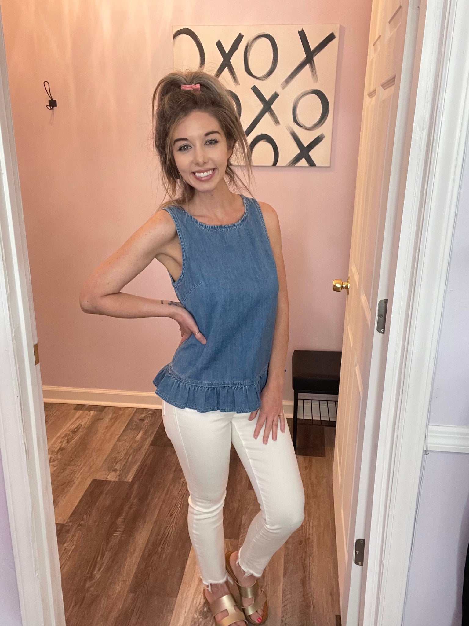 Feel cute and girly in this denim blue ruffle hem button down back peplum top! Dress it up or down. Wear to work, out with friends, or on a date! No amount of stretch. FAUX buttons, just for looks. True to size.