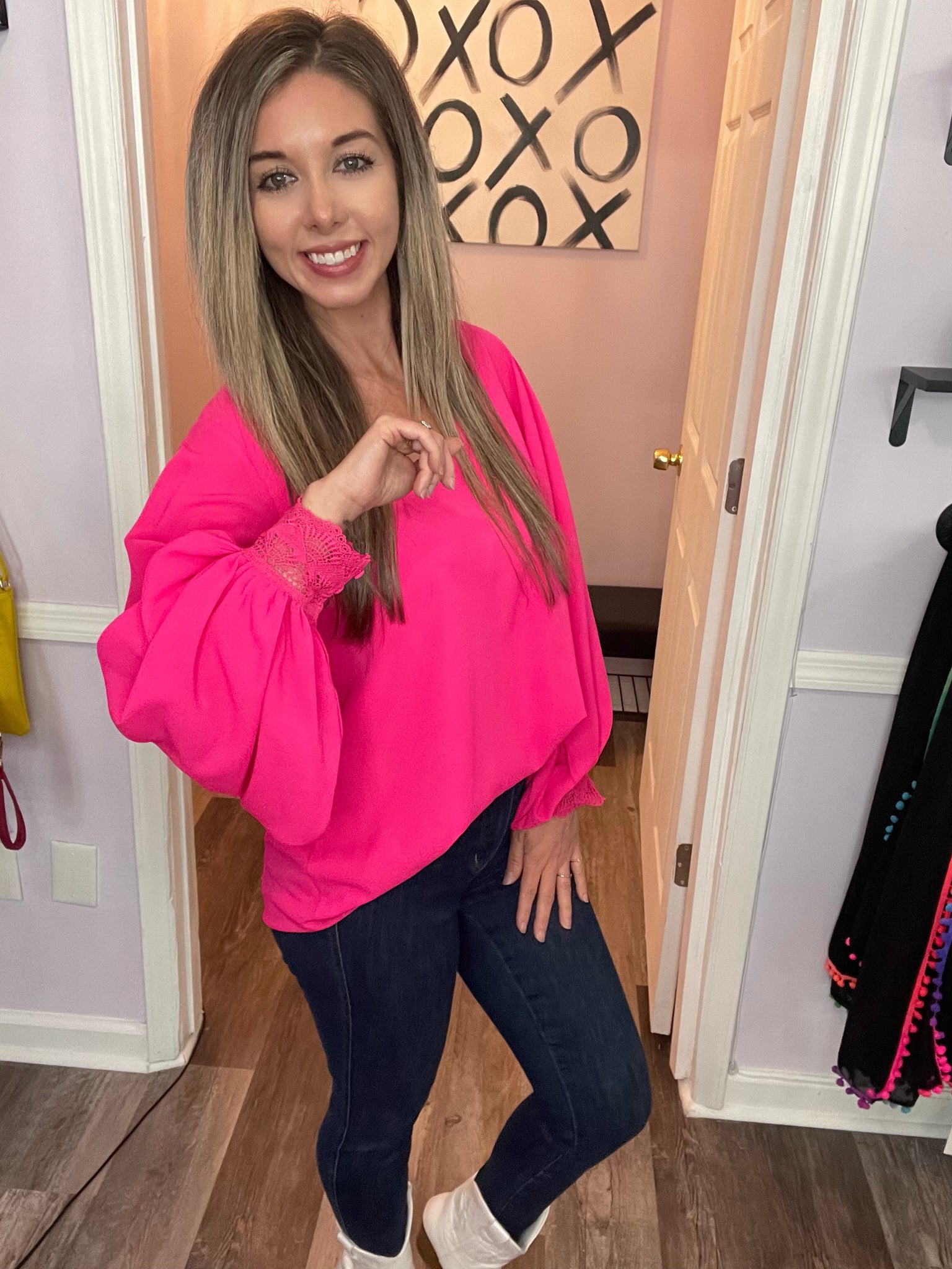 Feel cute and comfy in this fuchsia v neck lace wrists long sleeve oversized top. Wear to work, out with friends, on a date, etc! NO amount of stretch. Naturally oversized fit.