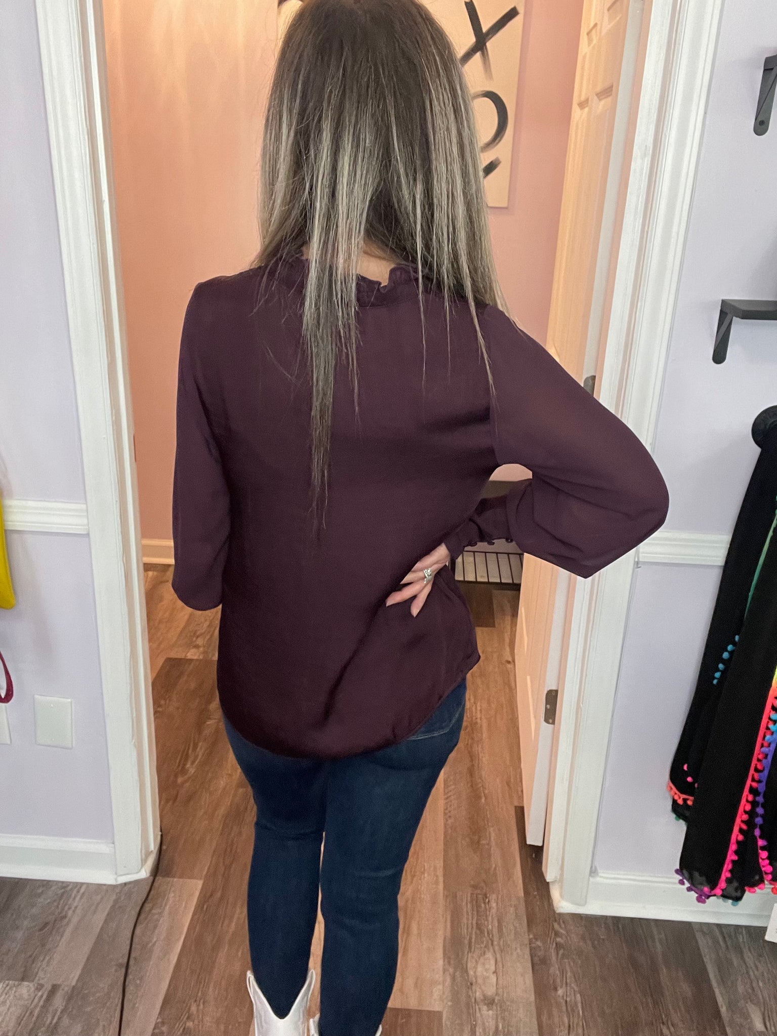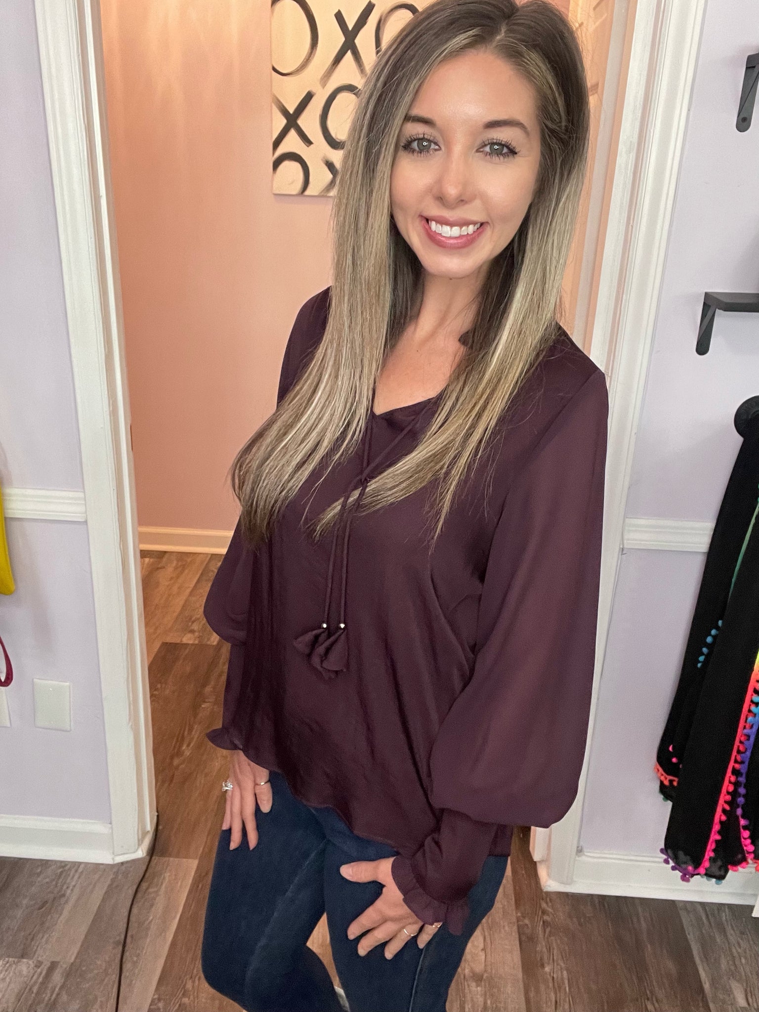 Feel cute and classy in this dark plum tassel sheer long sleeve top. Wear to work, out with friends, on a date, etc! NO amount of stretch. True to size.