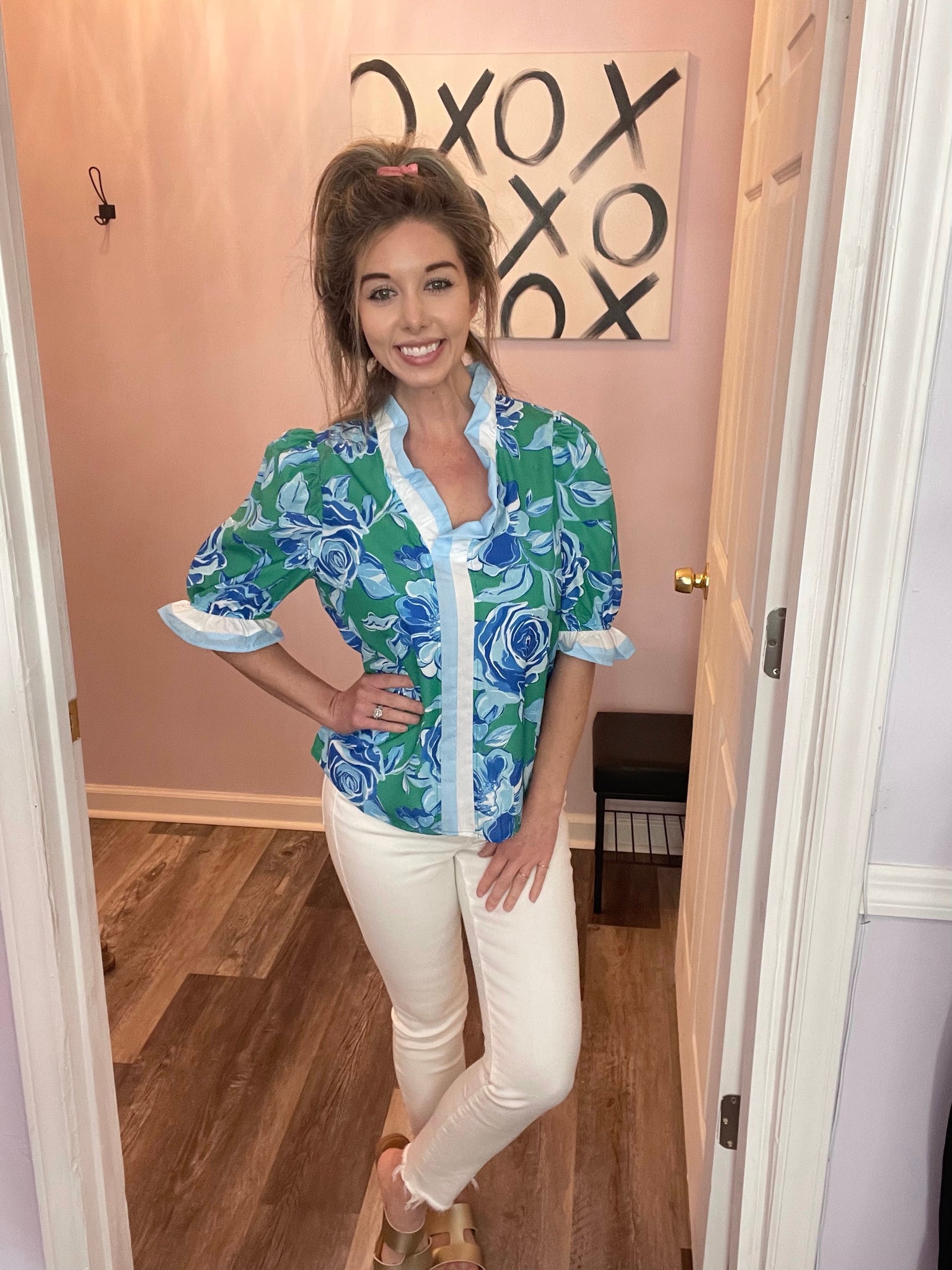 Feel cute and girly in this green & blue floral print ruffle sleeve & neckline top! Dress it up or down. Wear to work, out with friends, or on a date! No amount of stretch. True to size.