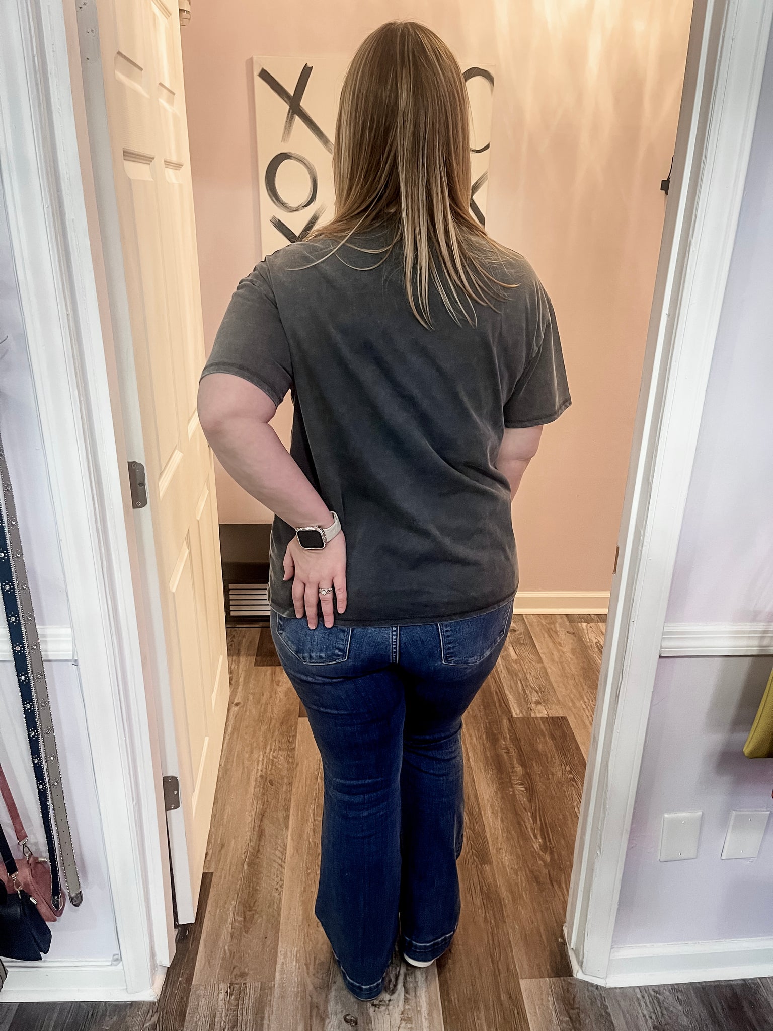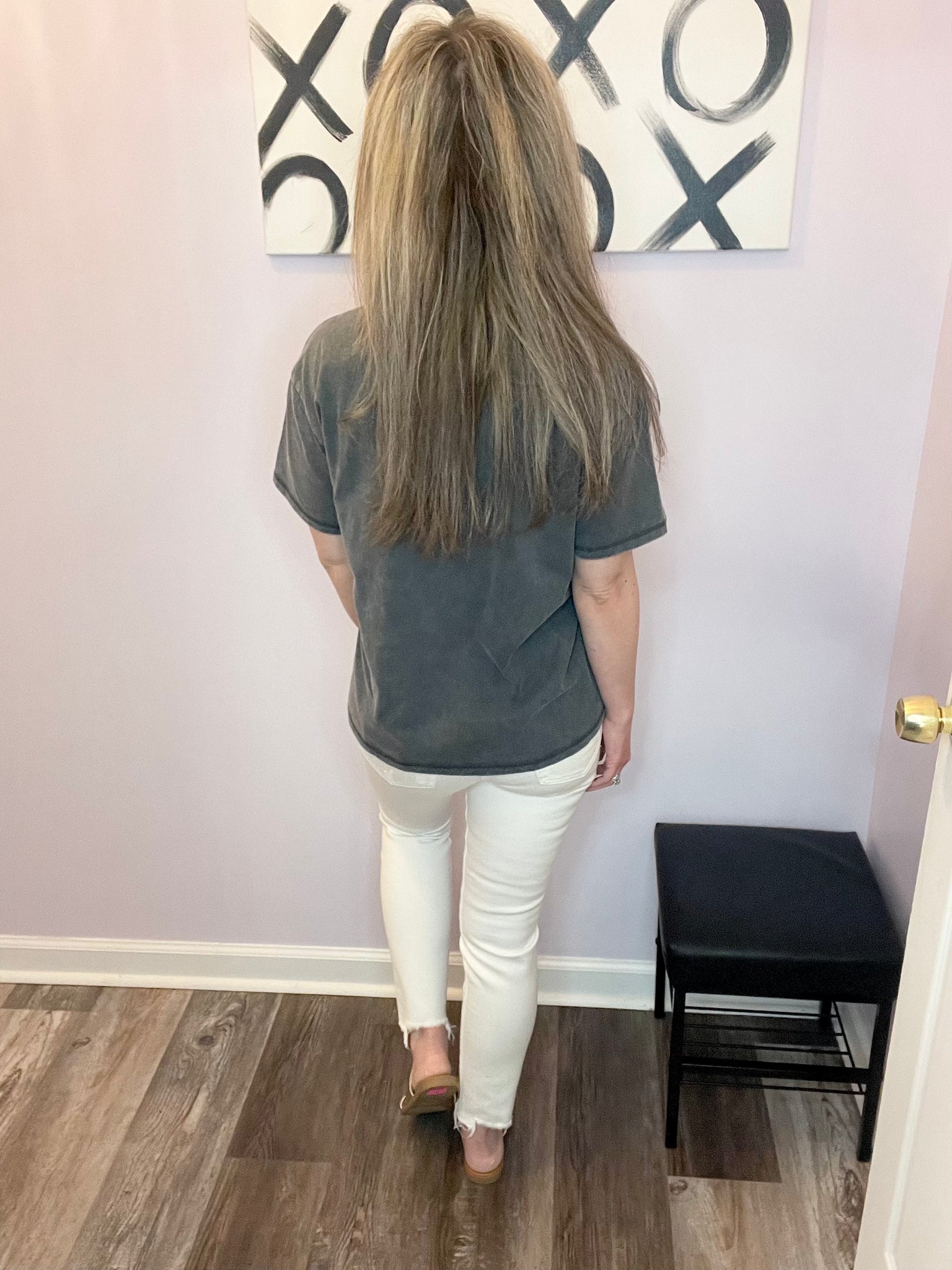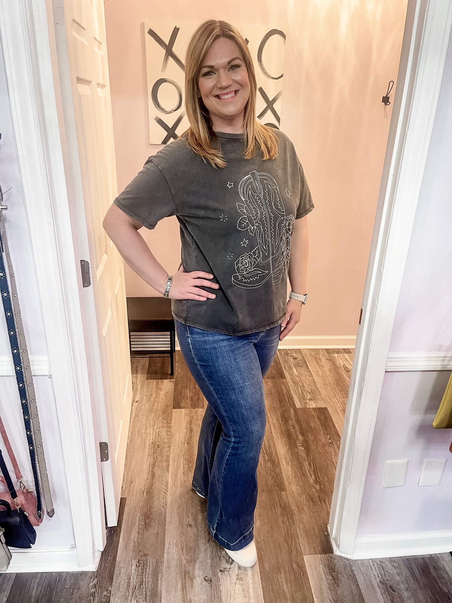 Feel cute and comfy in this grey & white washed western cowgirl boot & flowers t shirt! Dress it up or down. Wear out with friends, to a concert, or on a date! Some stretch. True to size.