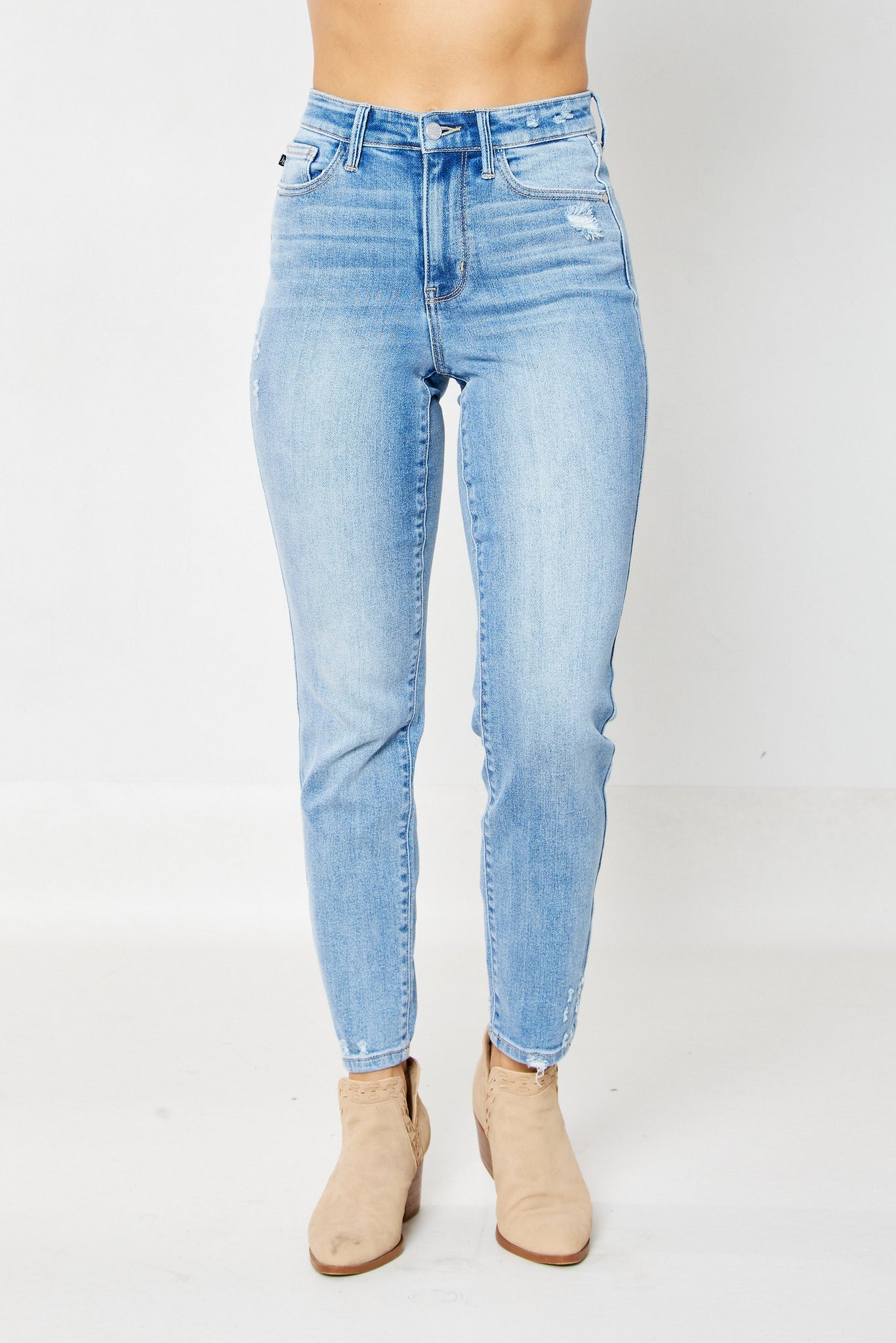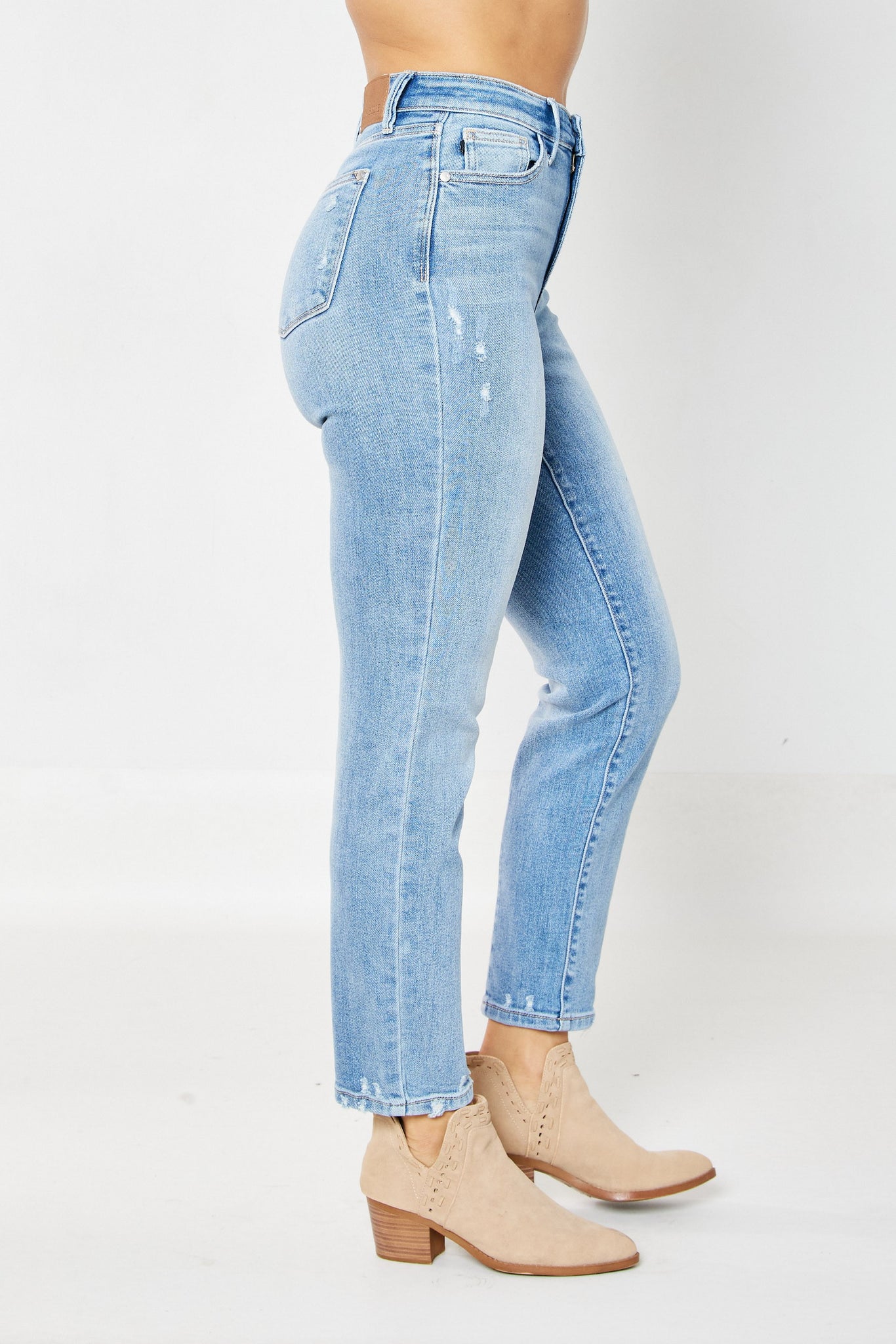These JUDY BLUE plus size jeans are a MUST! High rise with a good amount of stretch. Very comfortable. Functional pockets in the front and back. Slight distressing, no holes. True to size.