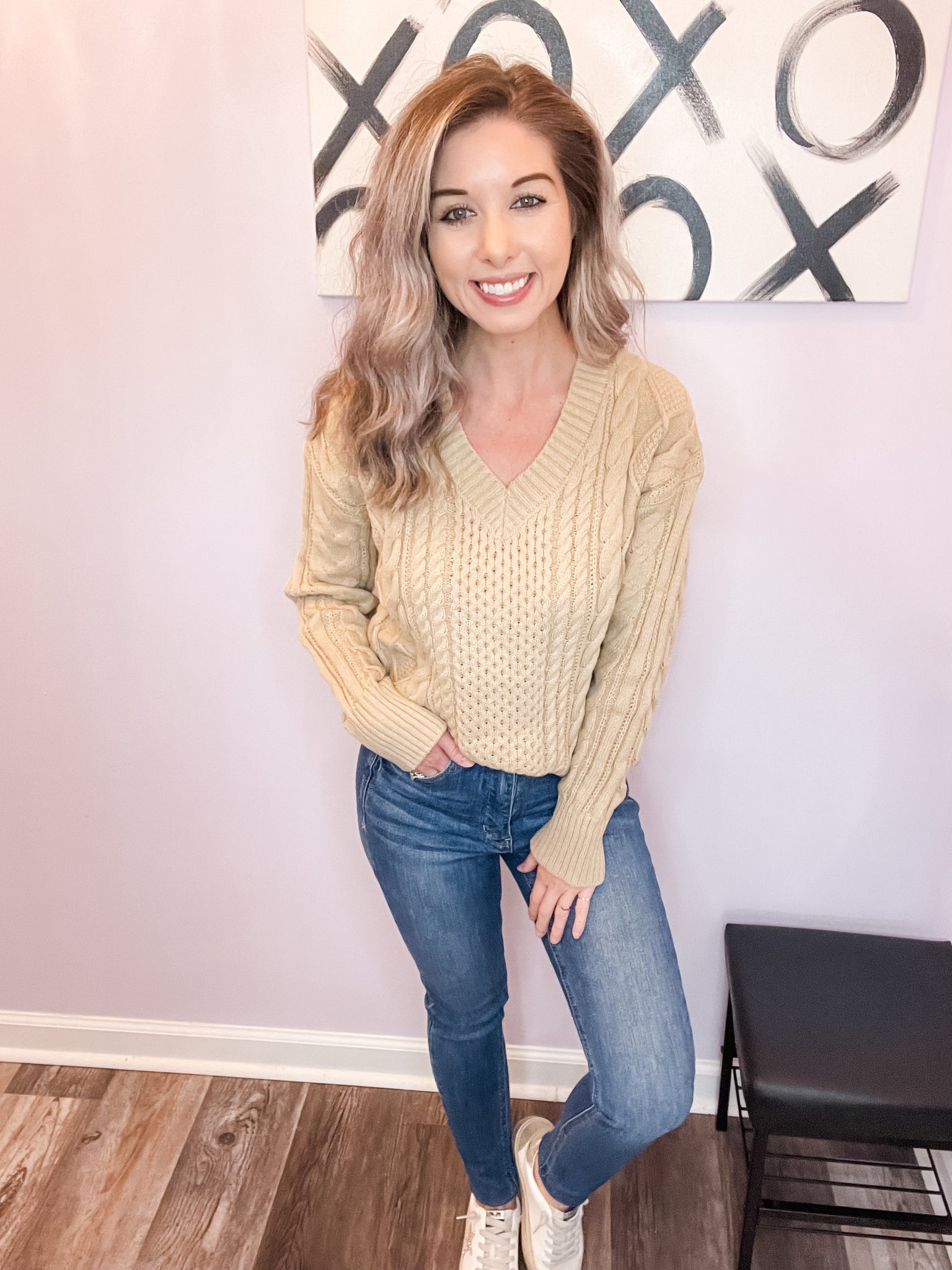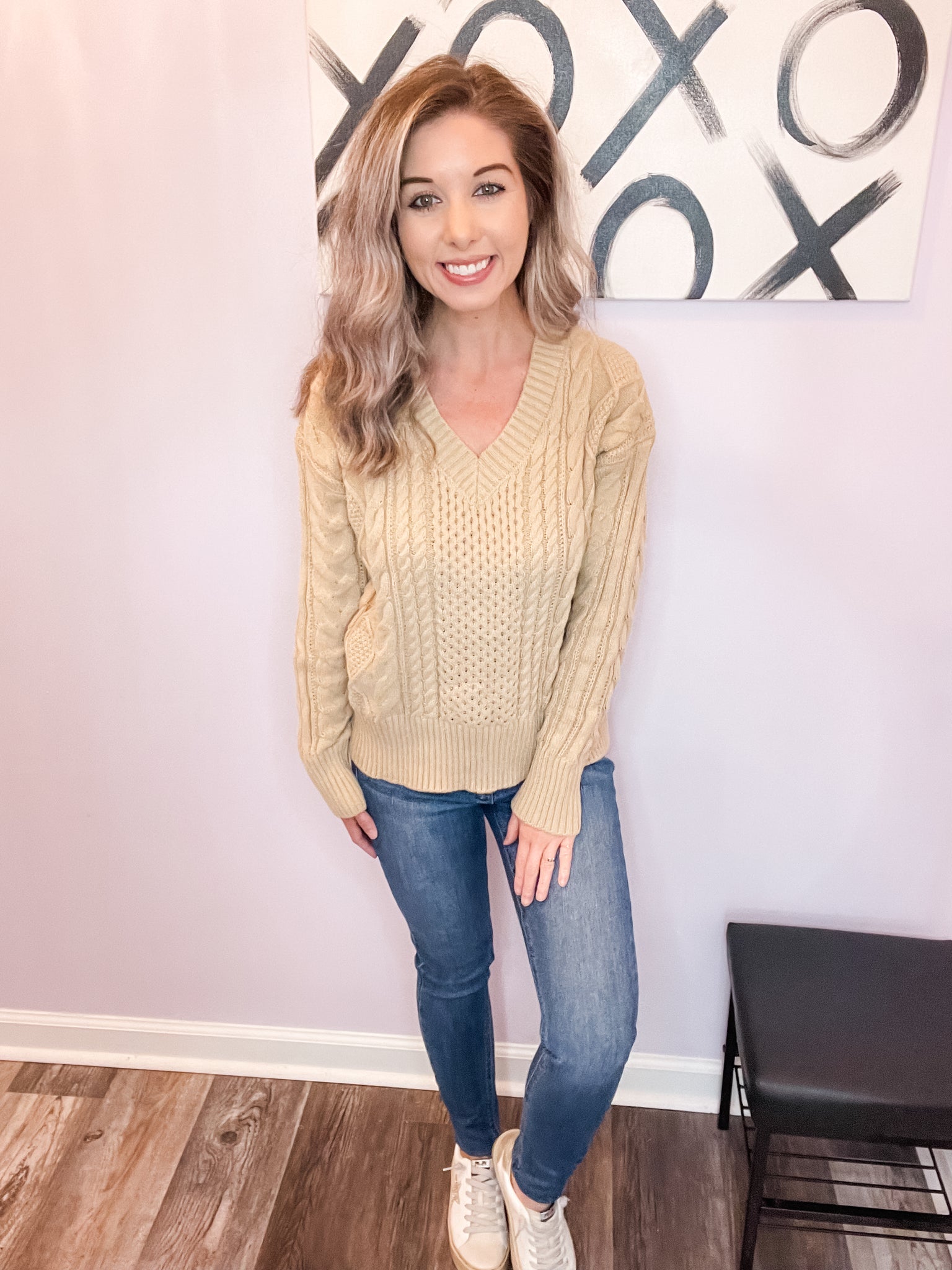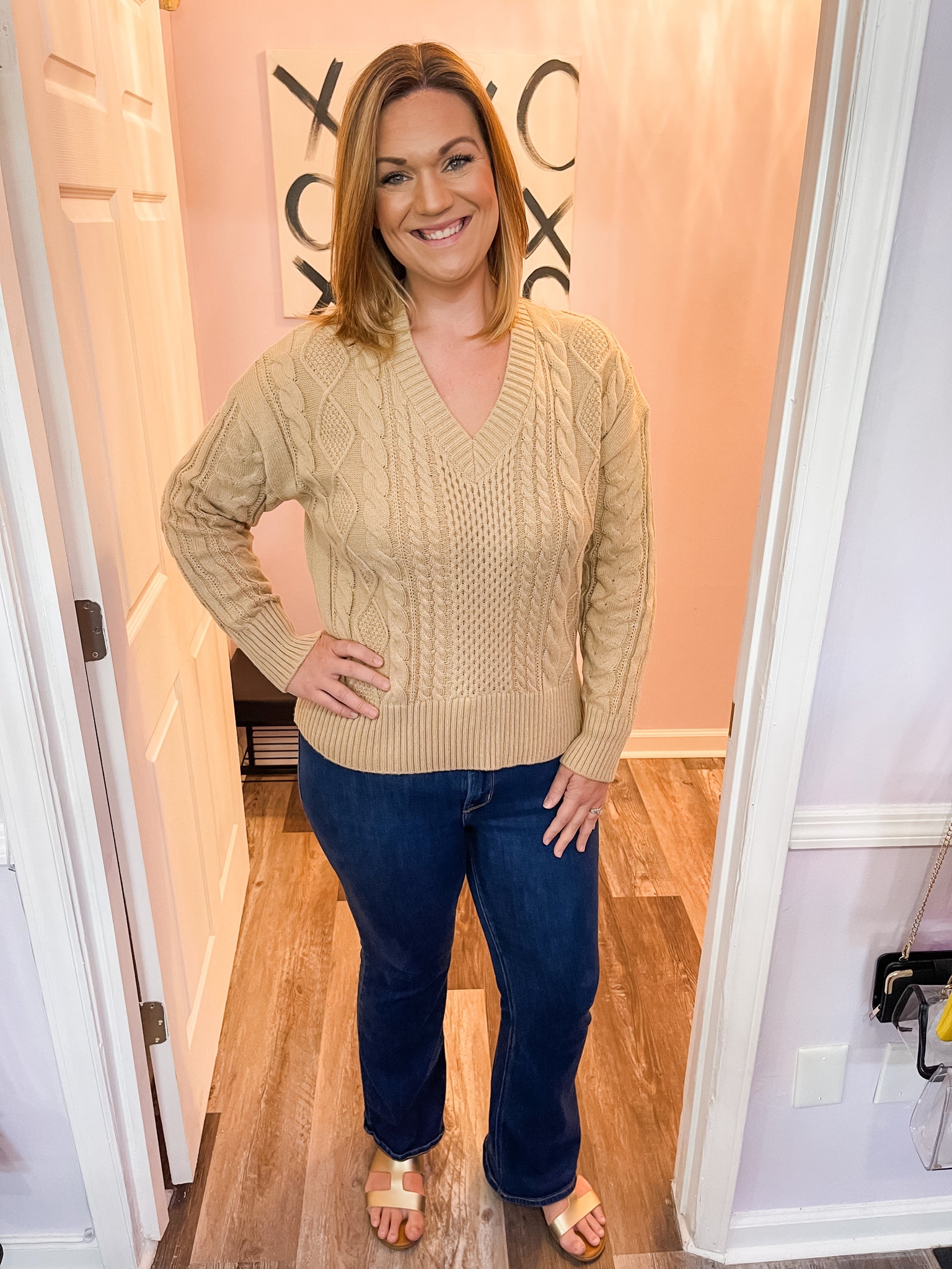 SOFT & WARM! Feel cute and comfy in this khaki twisted ribbed design sweater! Wear to work or out with friends! Good amount of stretch. True to size.