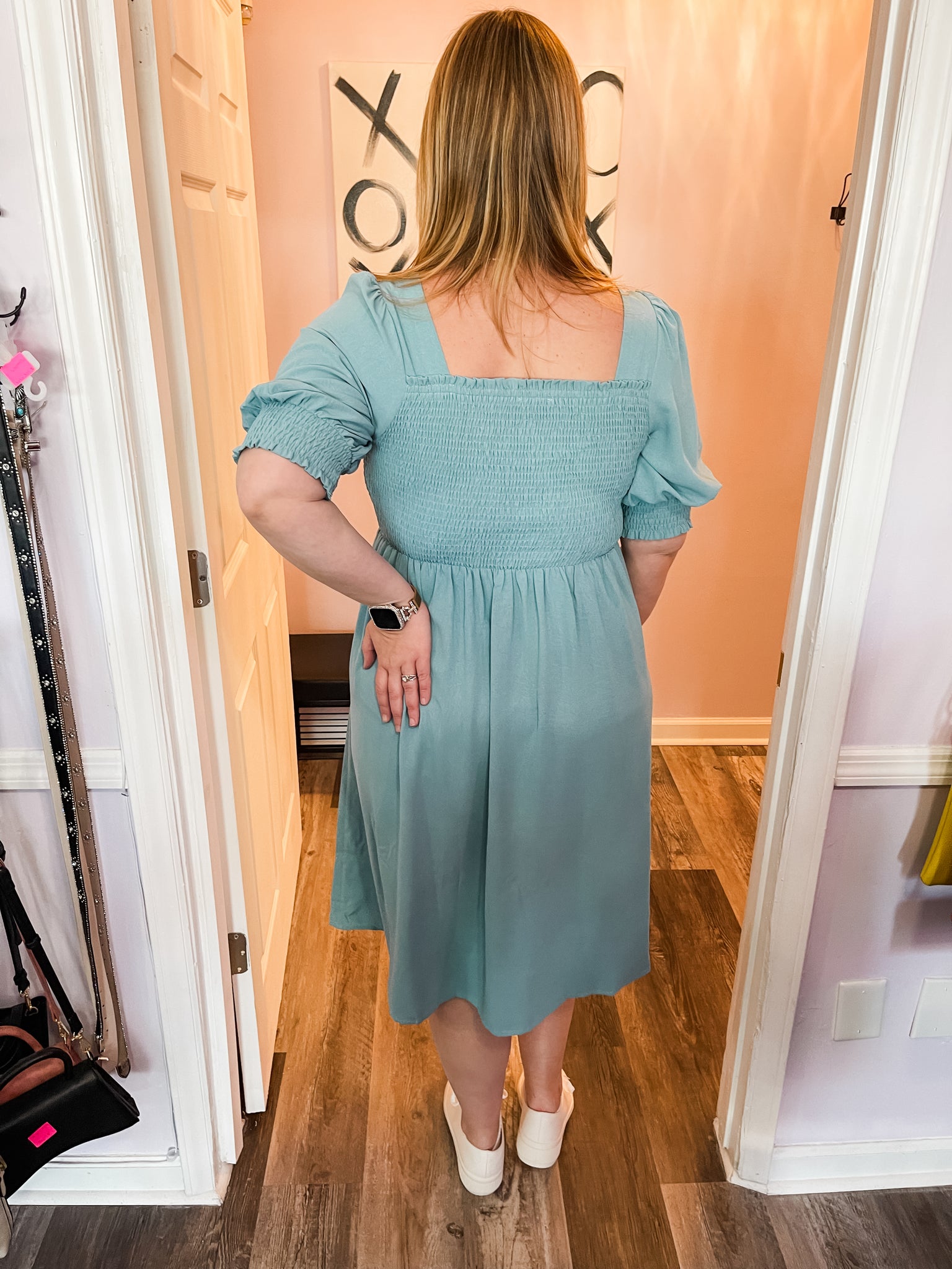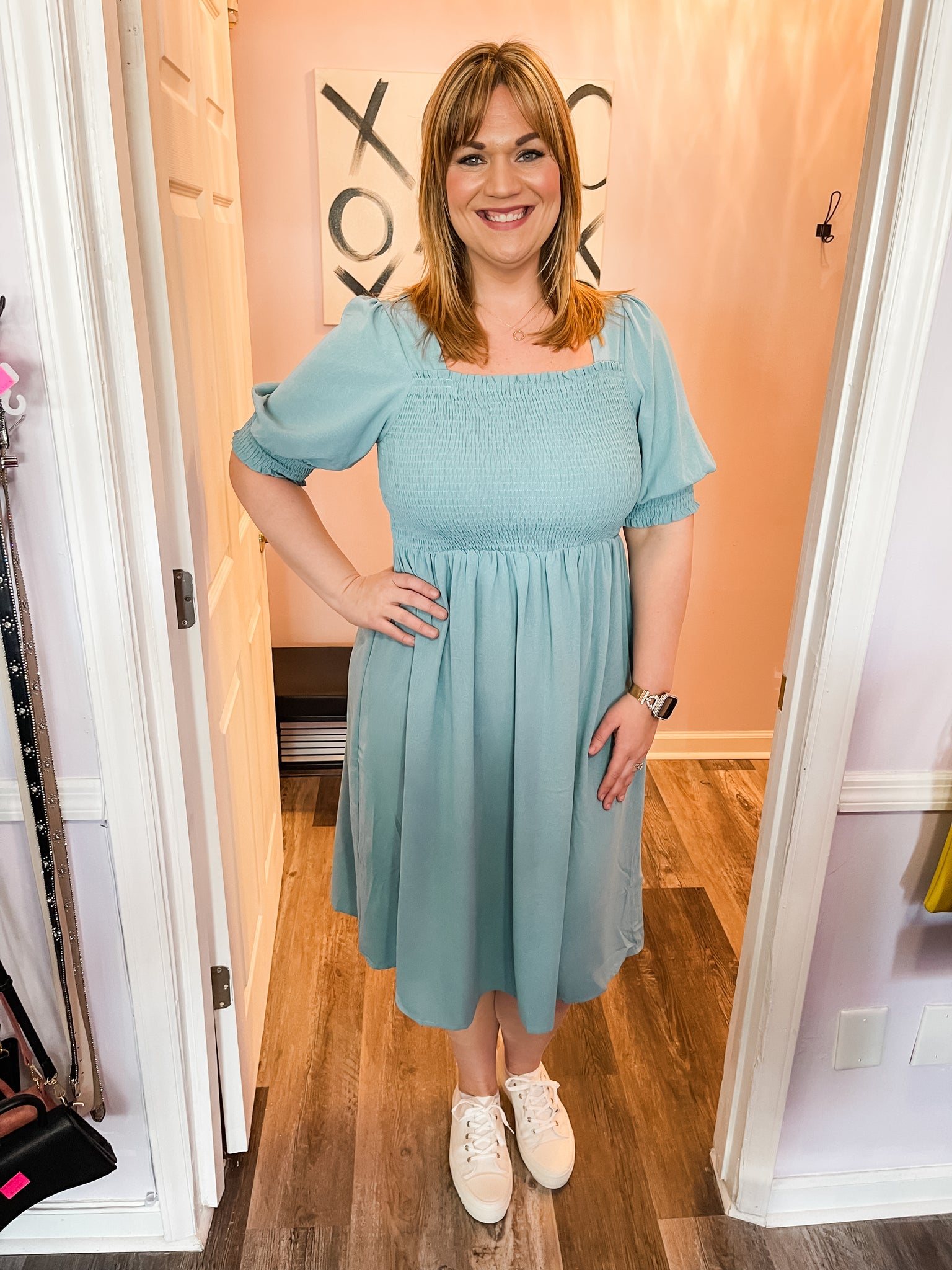 Feel cute and flirty in this mineral blue smocked midi dress! Dress it up or down. Wear to work or out with friends! No amount of stretch EXCEPT for the smocked upper top and smocked arm bands. True to size.