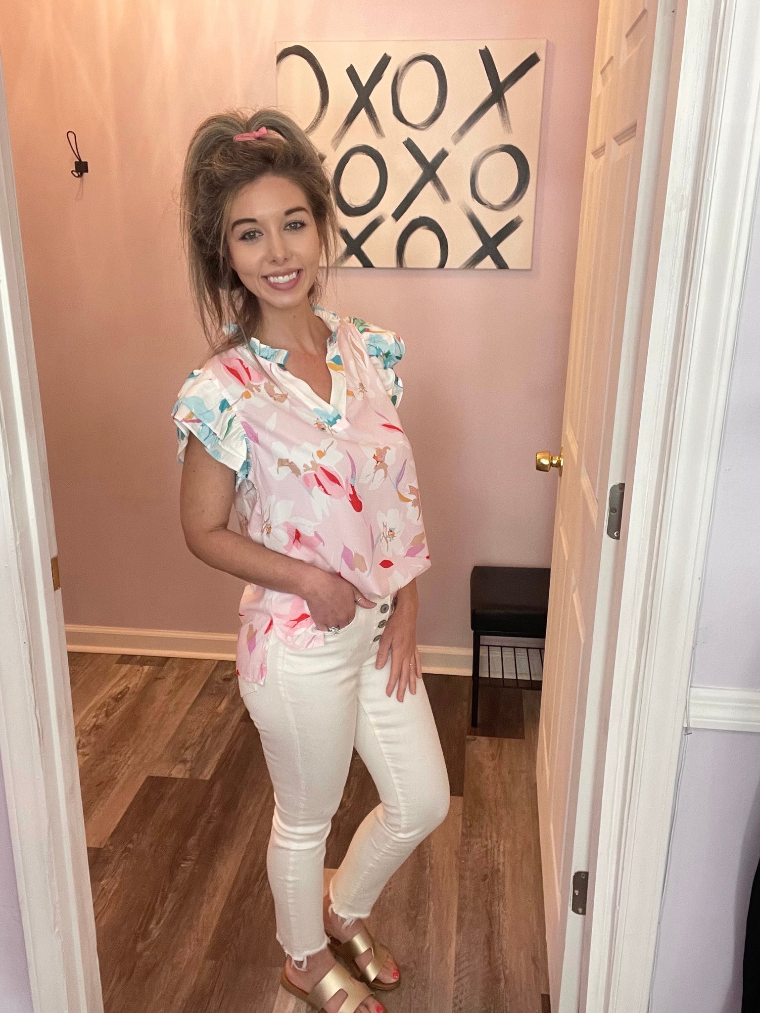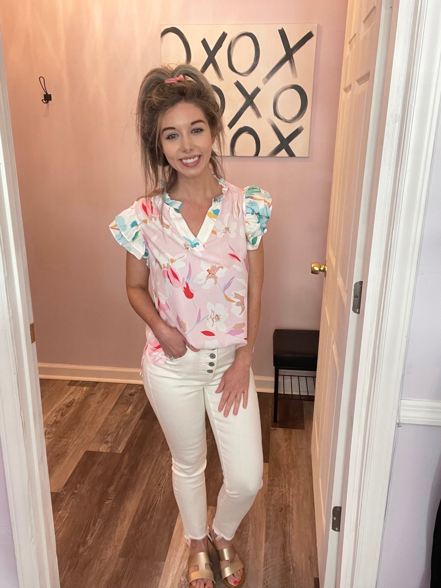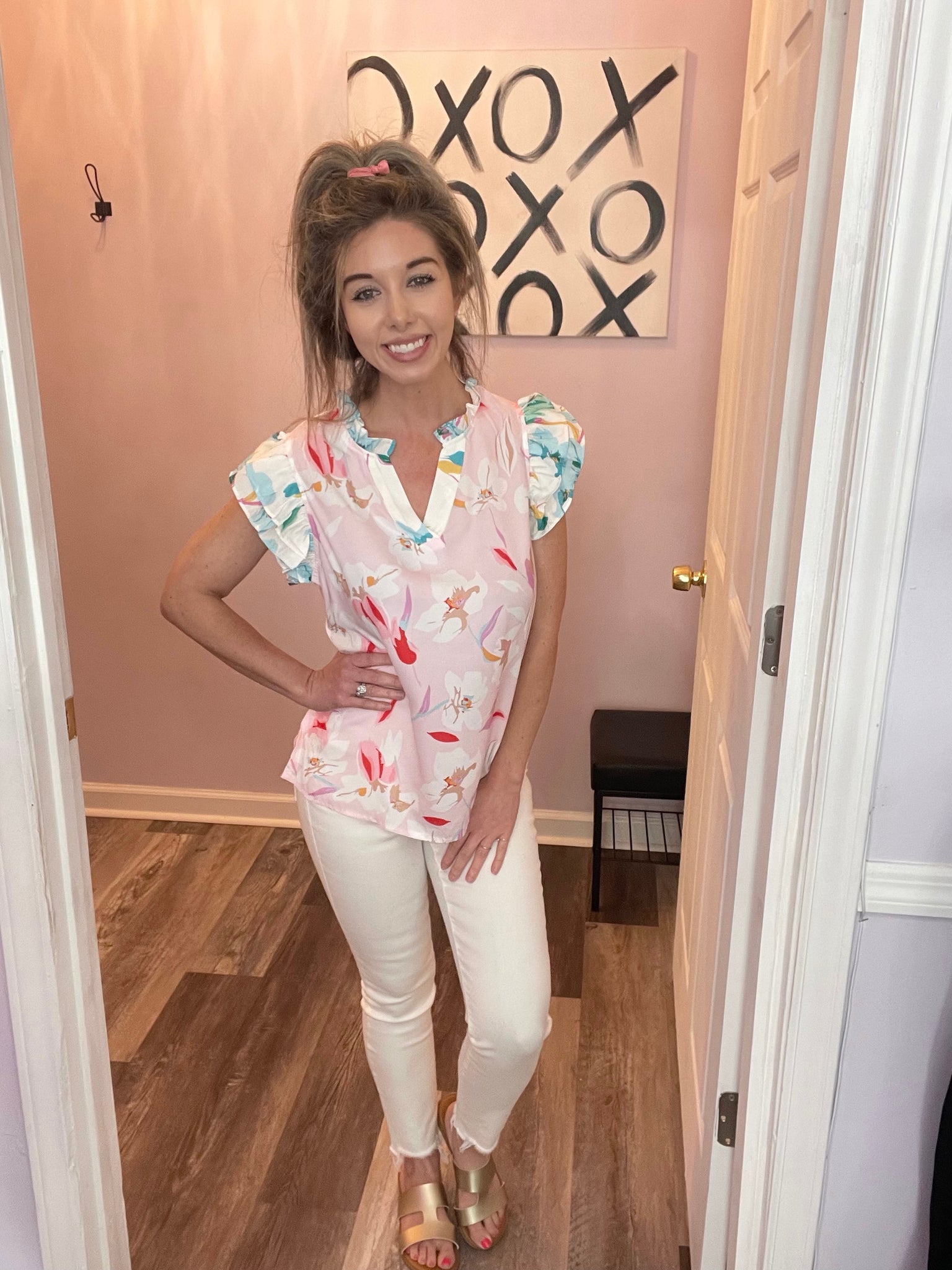 Feel cute and girly in this multi-colored floral frill sleeve v neck top! Dress it up or down. Wear to work, out with friends, or on a date! NO amount of stretch. True to size.