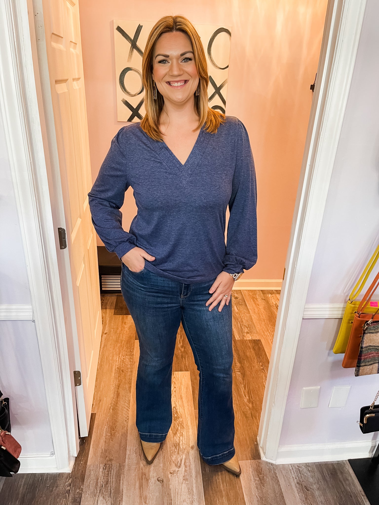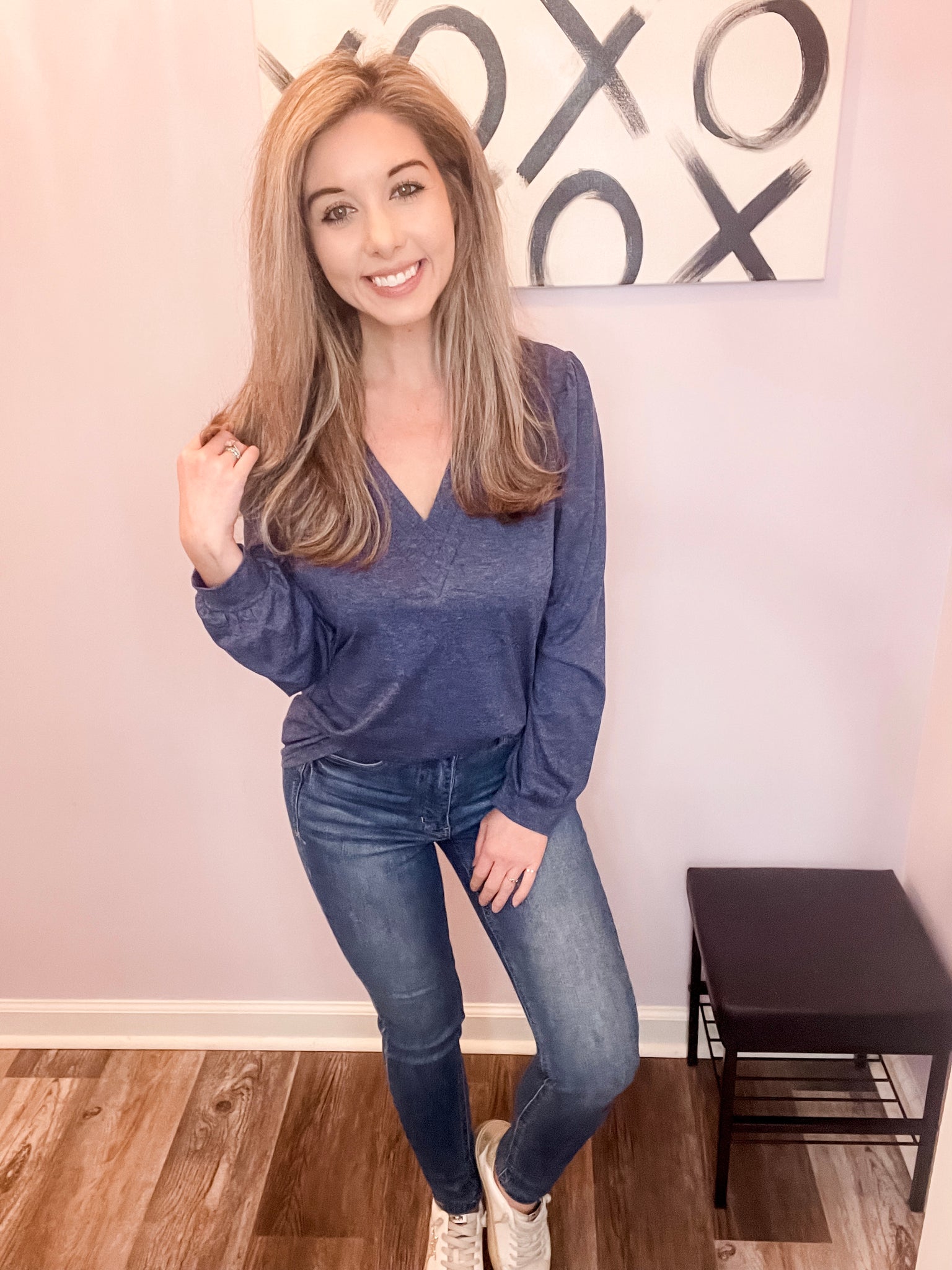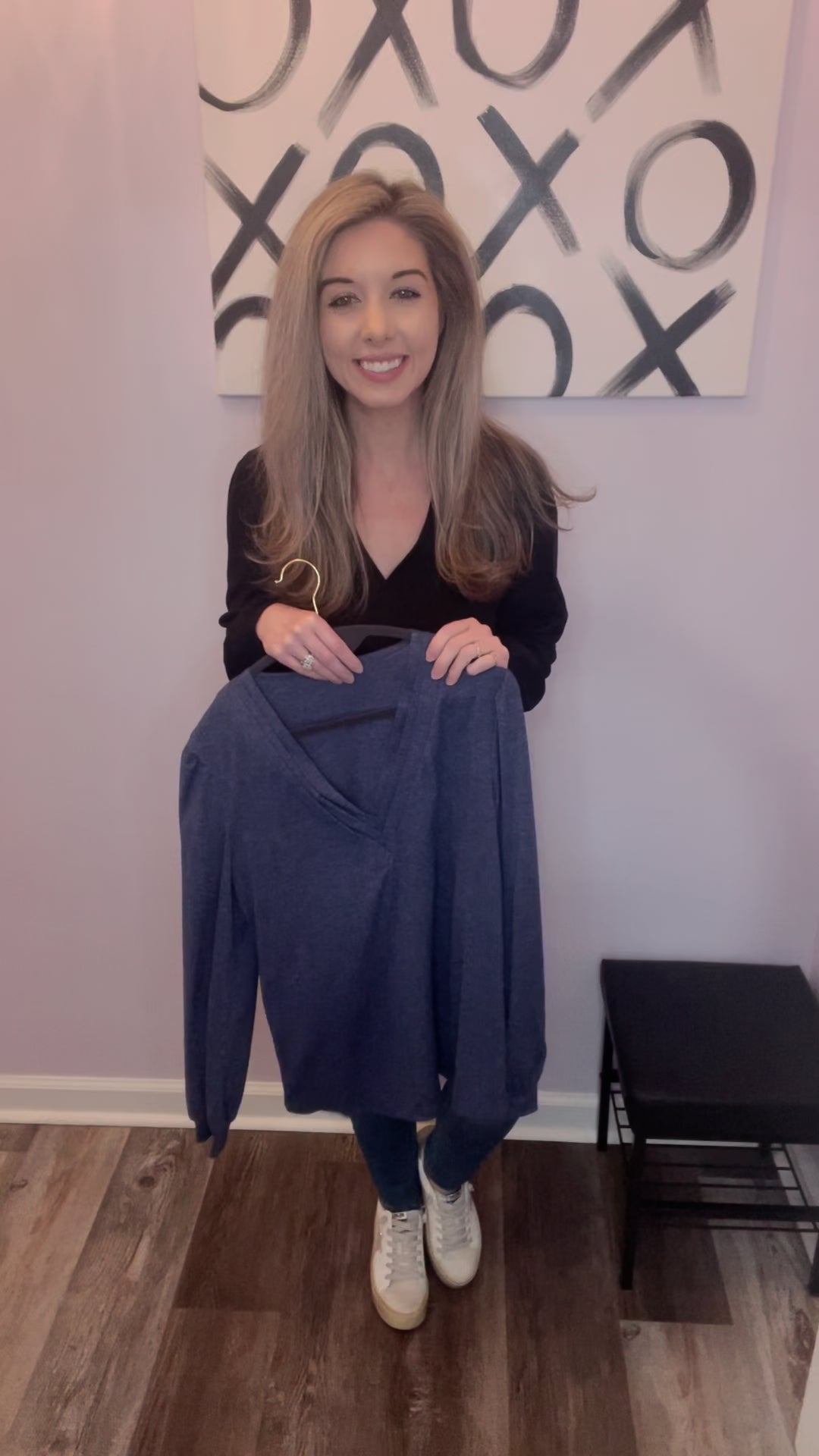 Feel cute and comfy in this navy triple lined design v neck top. Dress it up or down. Wear to work or out with friends! Good amount of stretch. True to size.