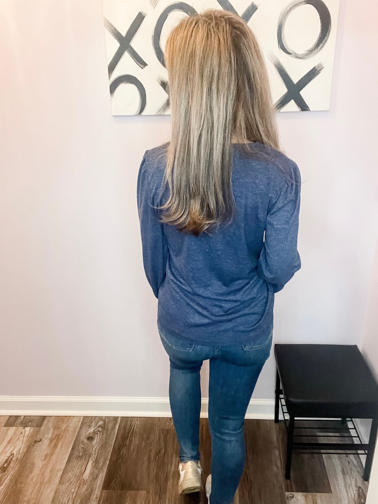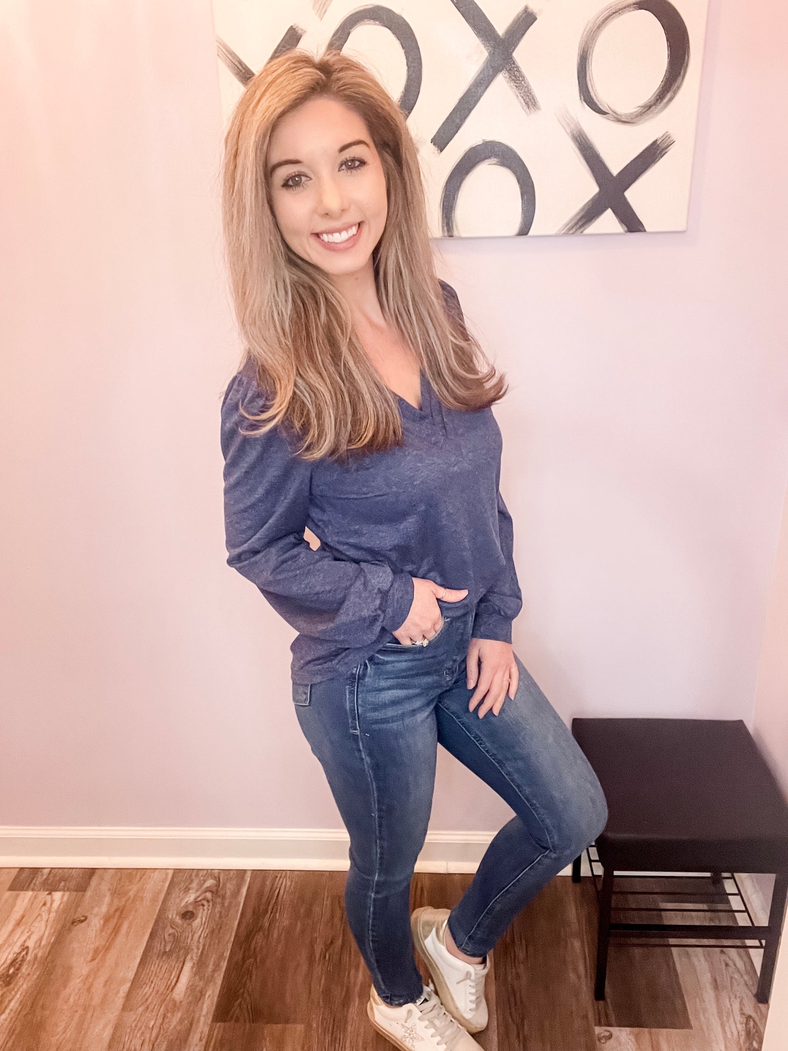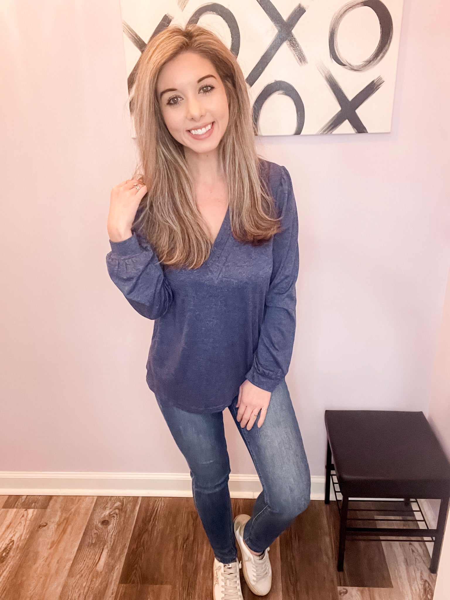 Feel cute and comfy in this navy triple lined design v neck top. Dress it up or down. Wear to work or out with friends! Good amount of stretch. True to size.