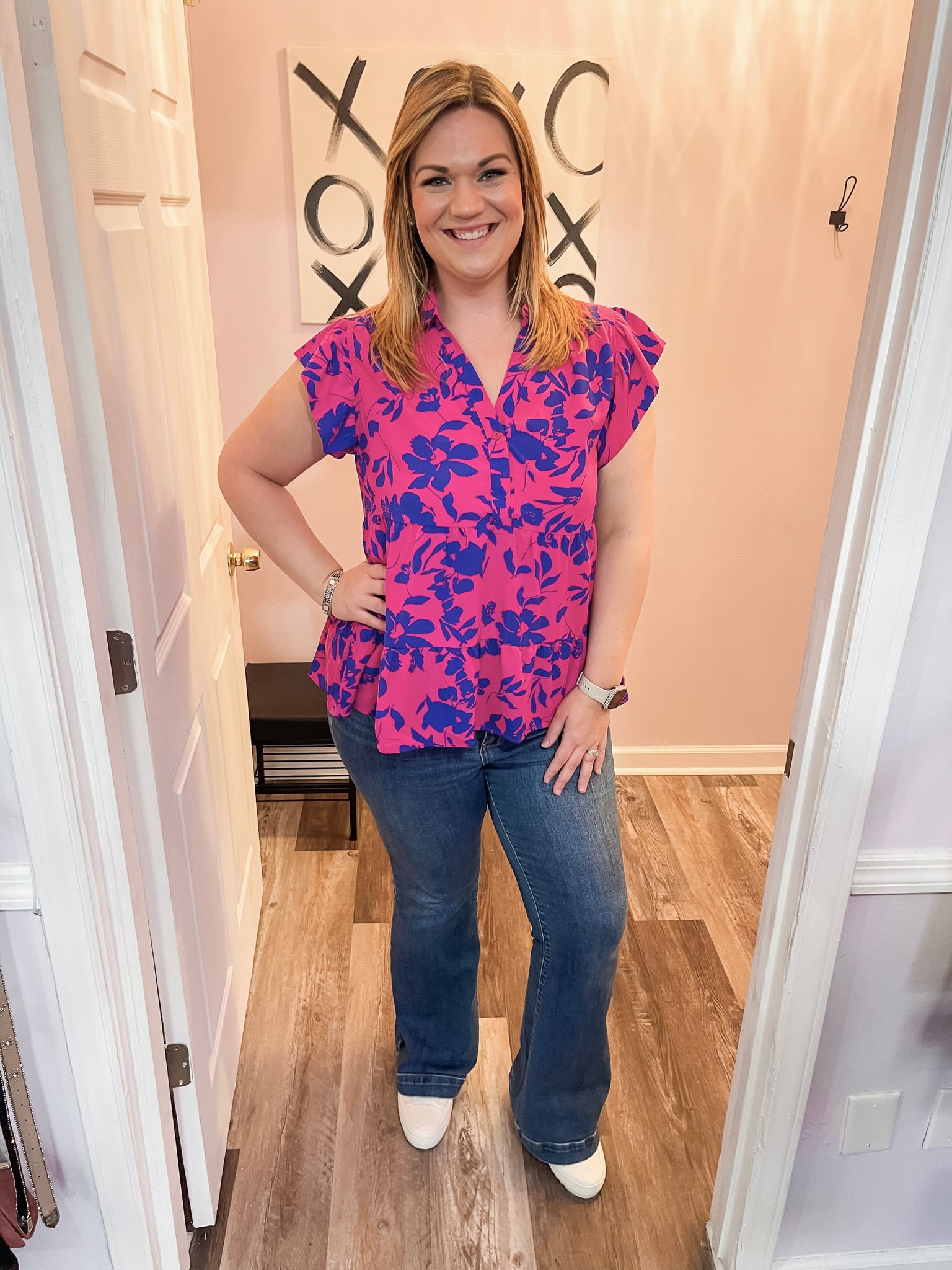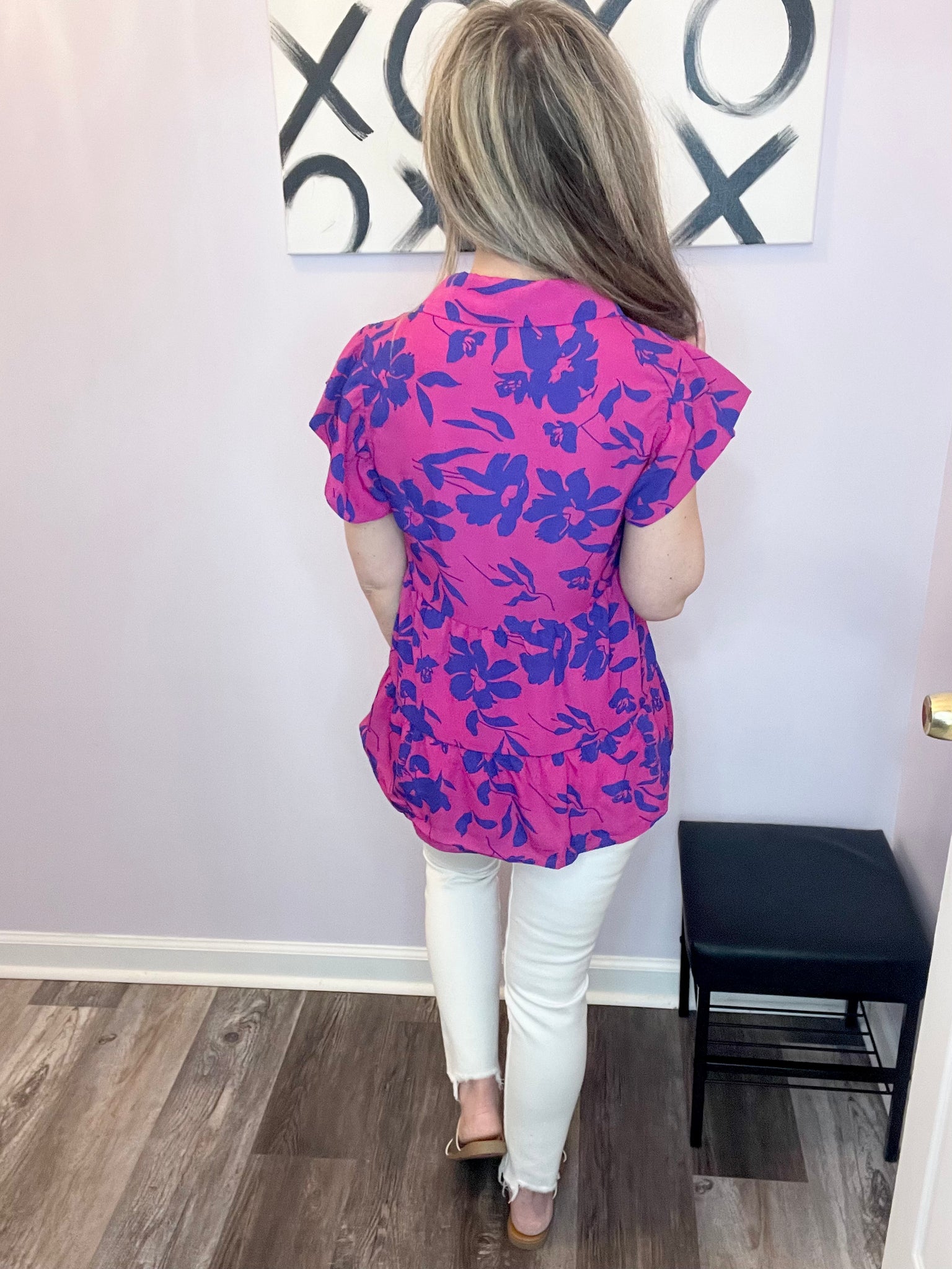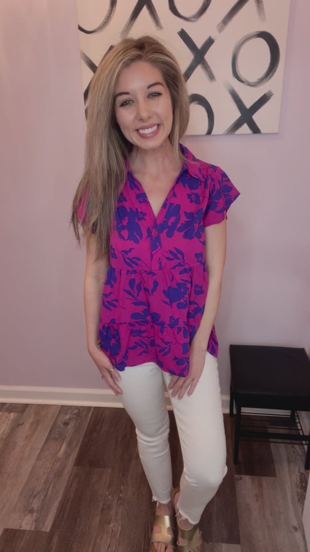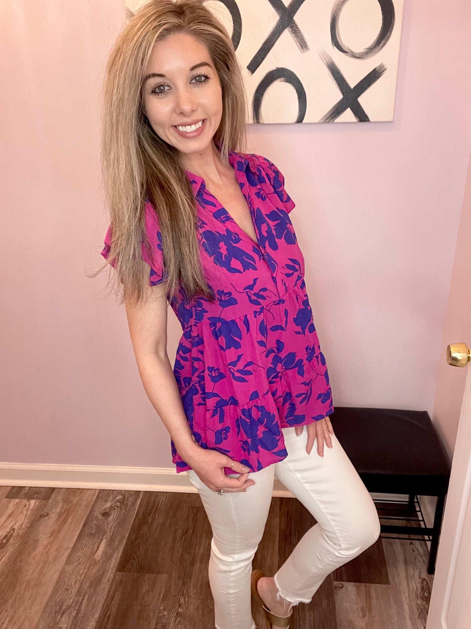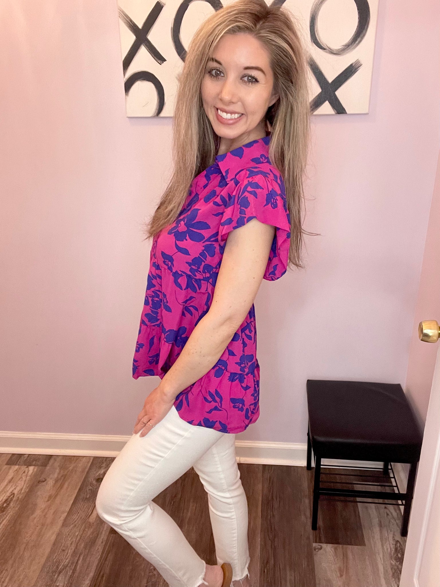 Feel cute and girly in this pink & blue collared neckline button flutter sleeve tiered top! Dress it up or down. Wear to work, out with friends, or on a date! NO amount of stretch. True to size.