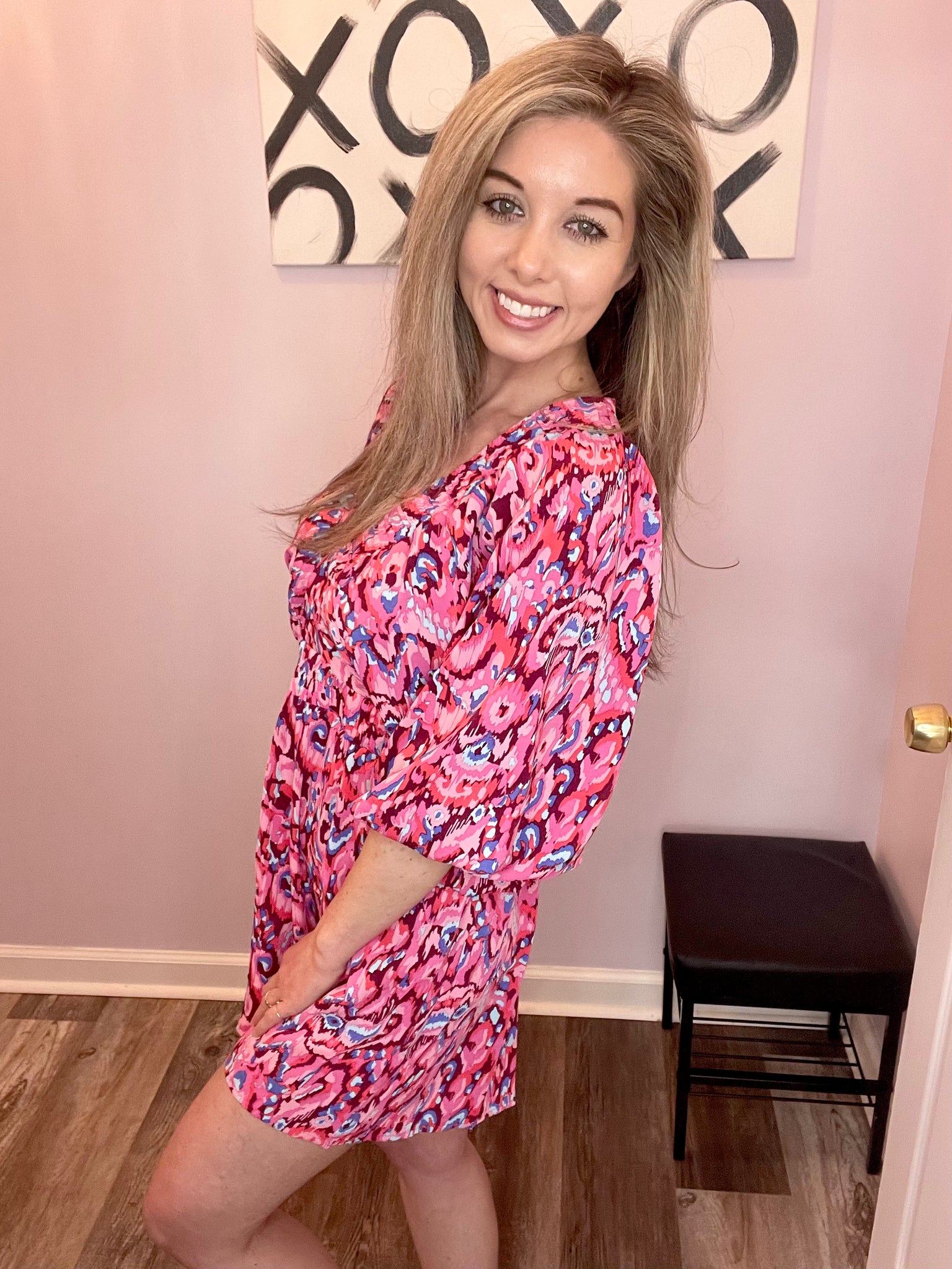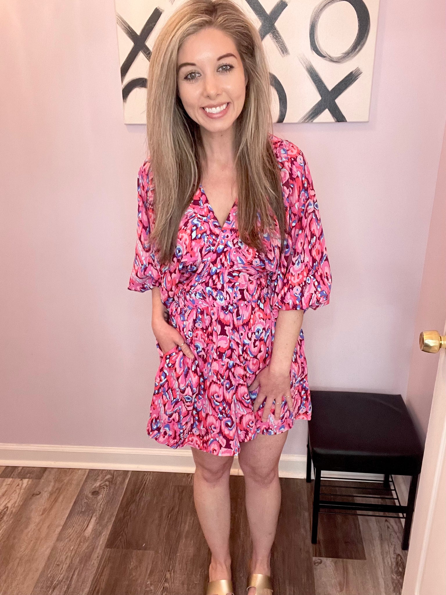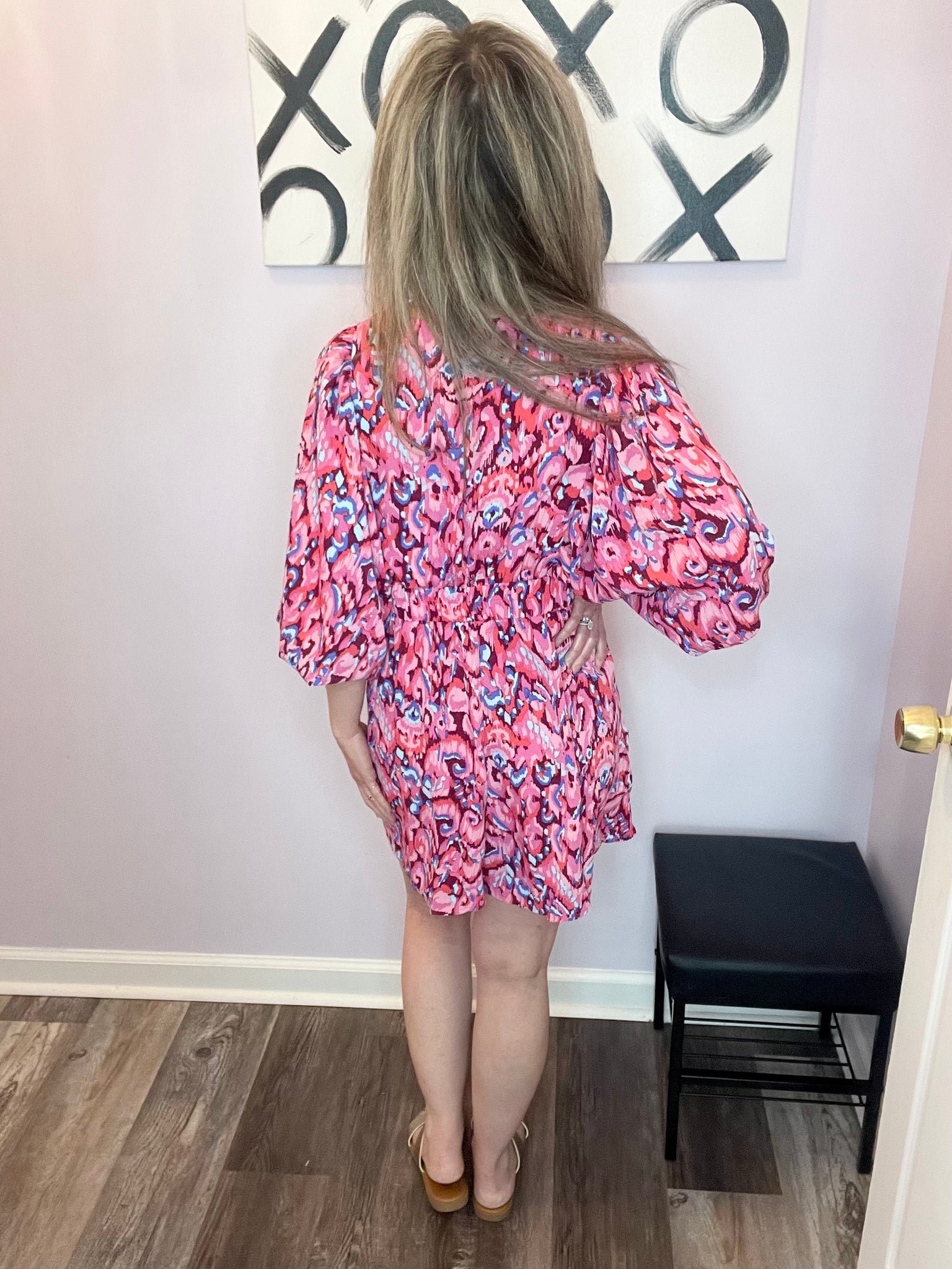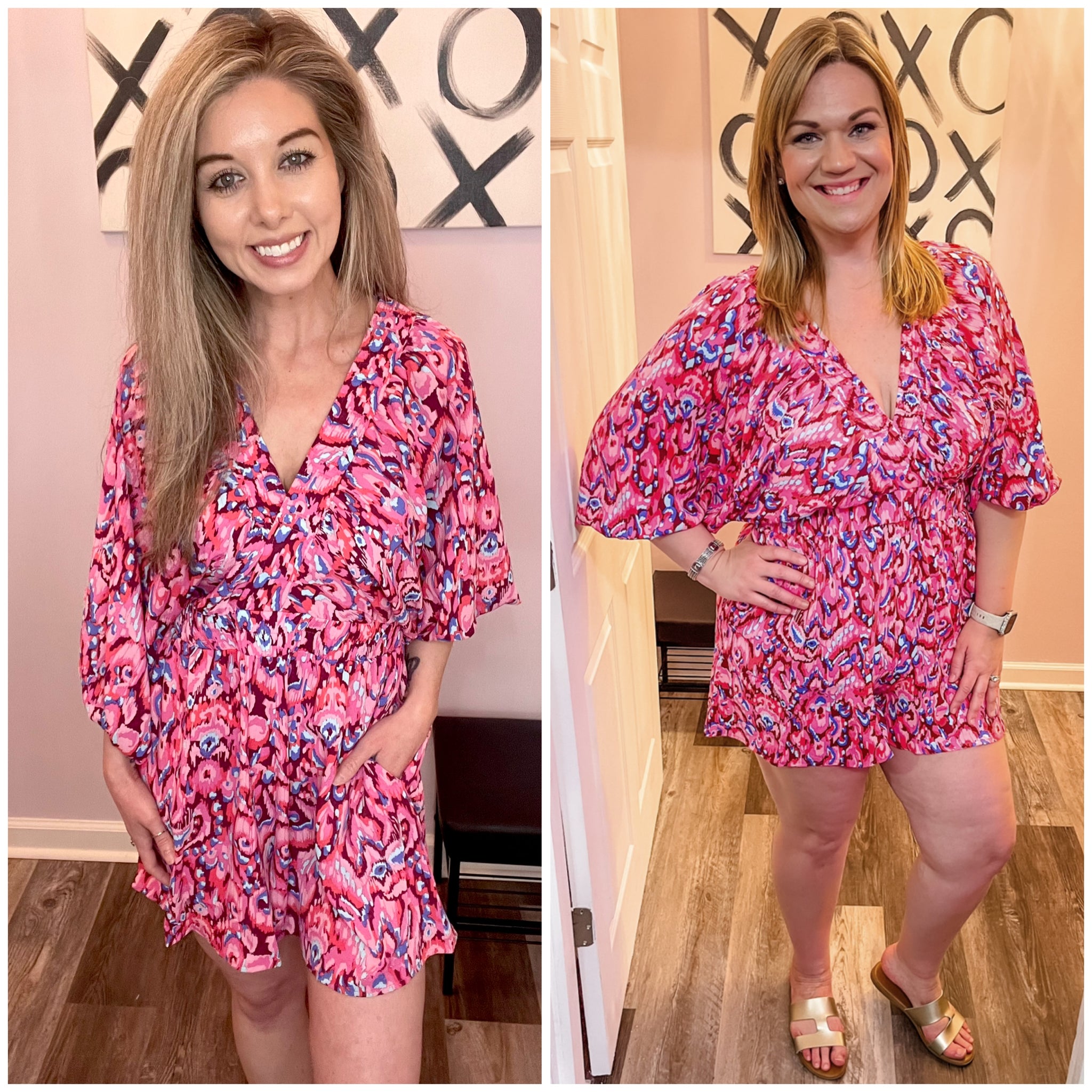Feel cute and girly in this pink & multi-colored abstract print romper! Dress it up or down. Wear on vacation, out with friends, or on a date! NO amount of stretch EXCEPT for the stretchy arm bands. Has pockets! True to size.