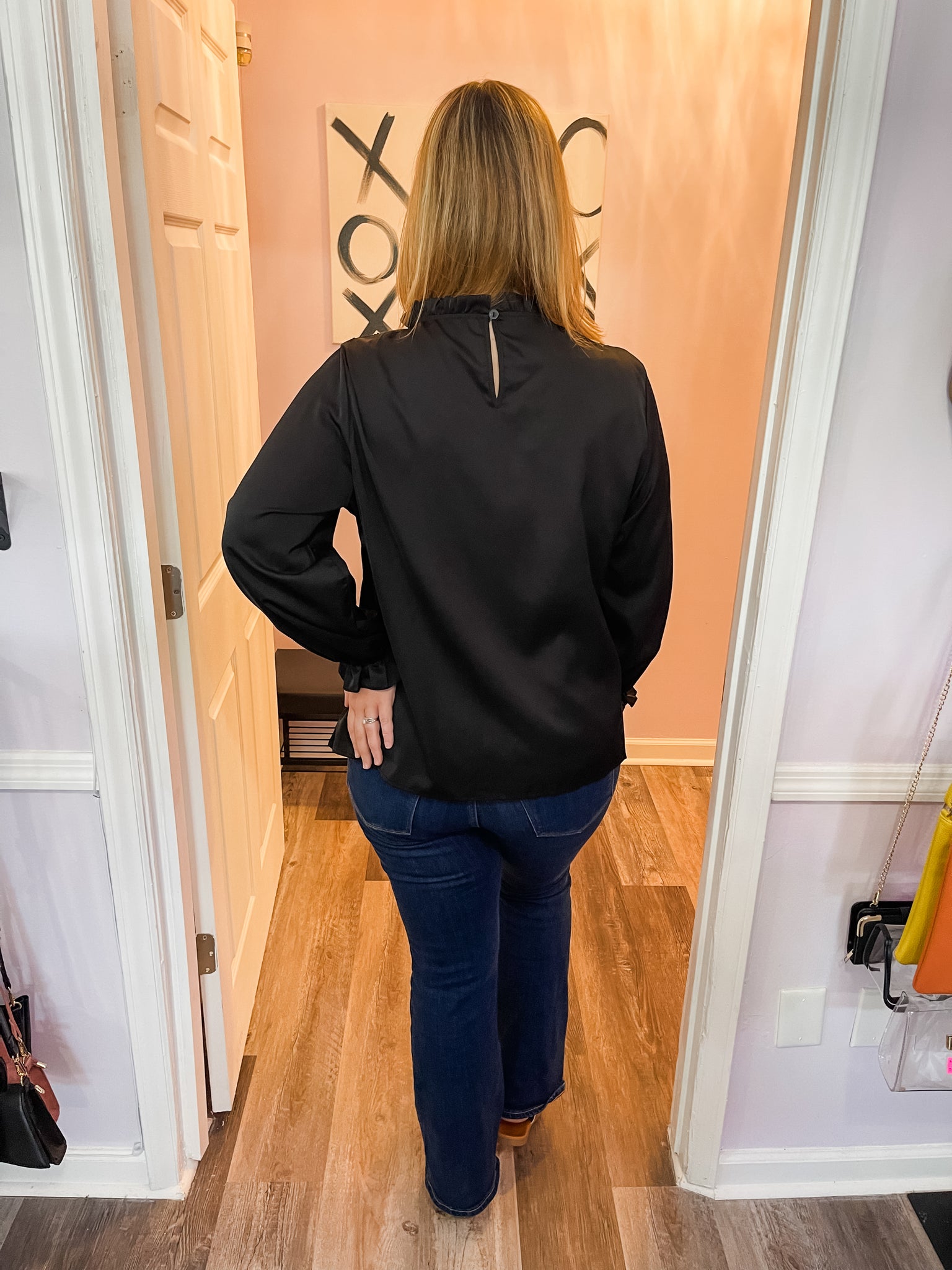 Feel cute and stylish in this plus size black & mesh bubble sleeve flared wrist long sleeve top! Wear to work or out with friends! NO amount of stretch EXCEPT for the stretchy wrist band. Self buttoned keyhole in the back. True to size.