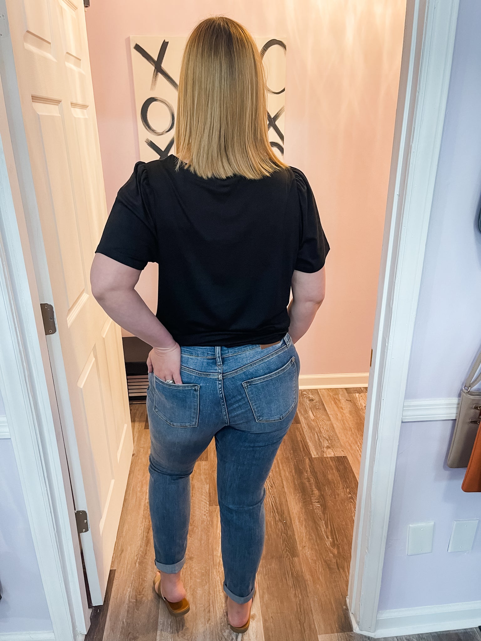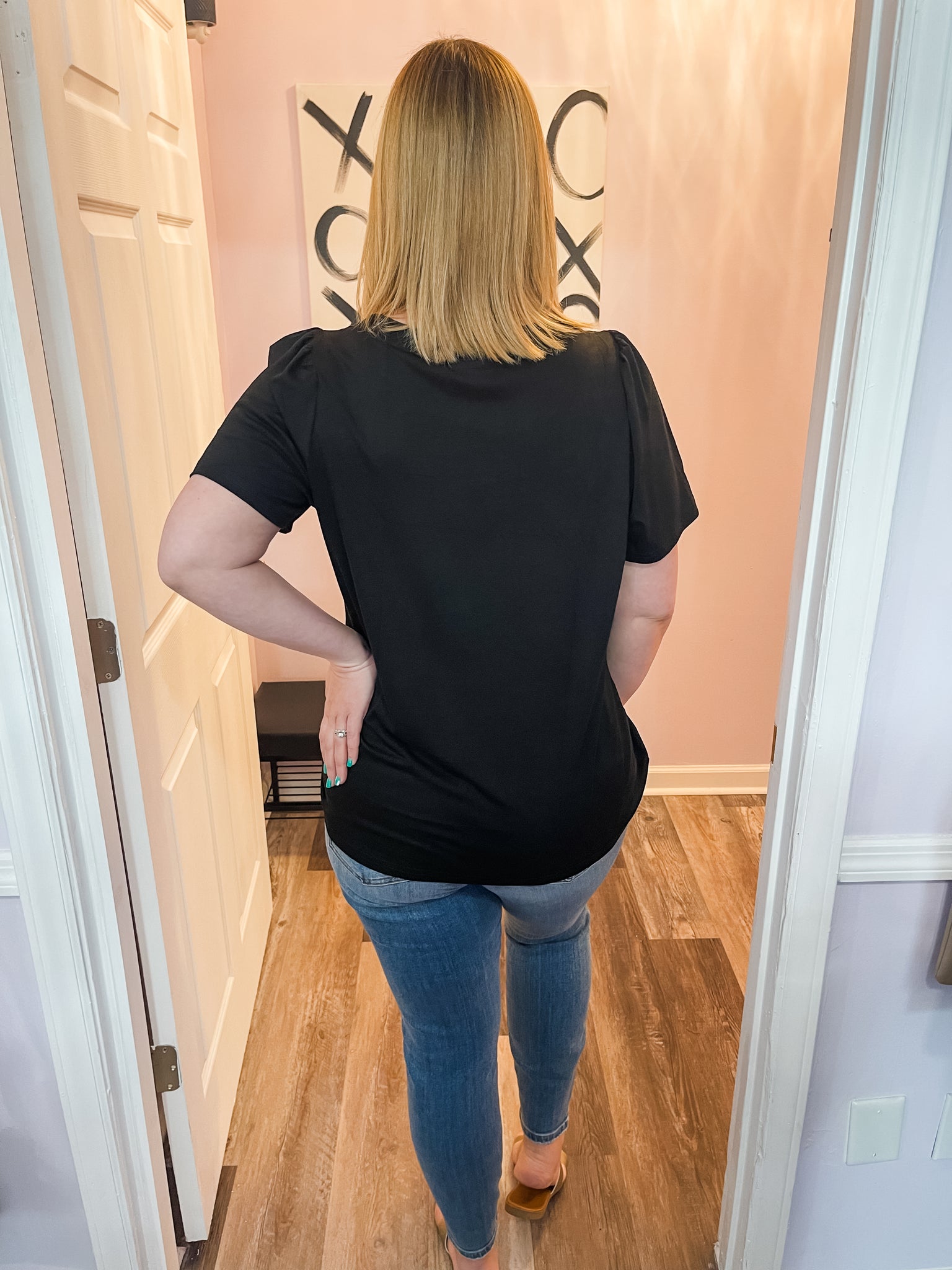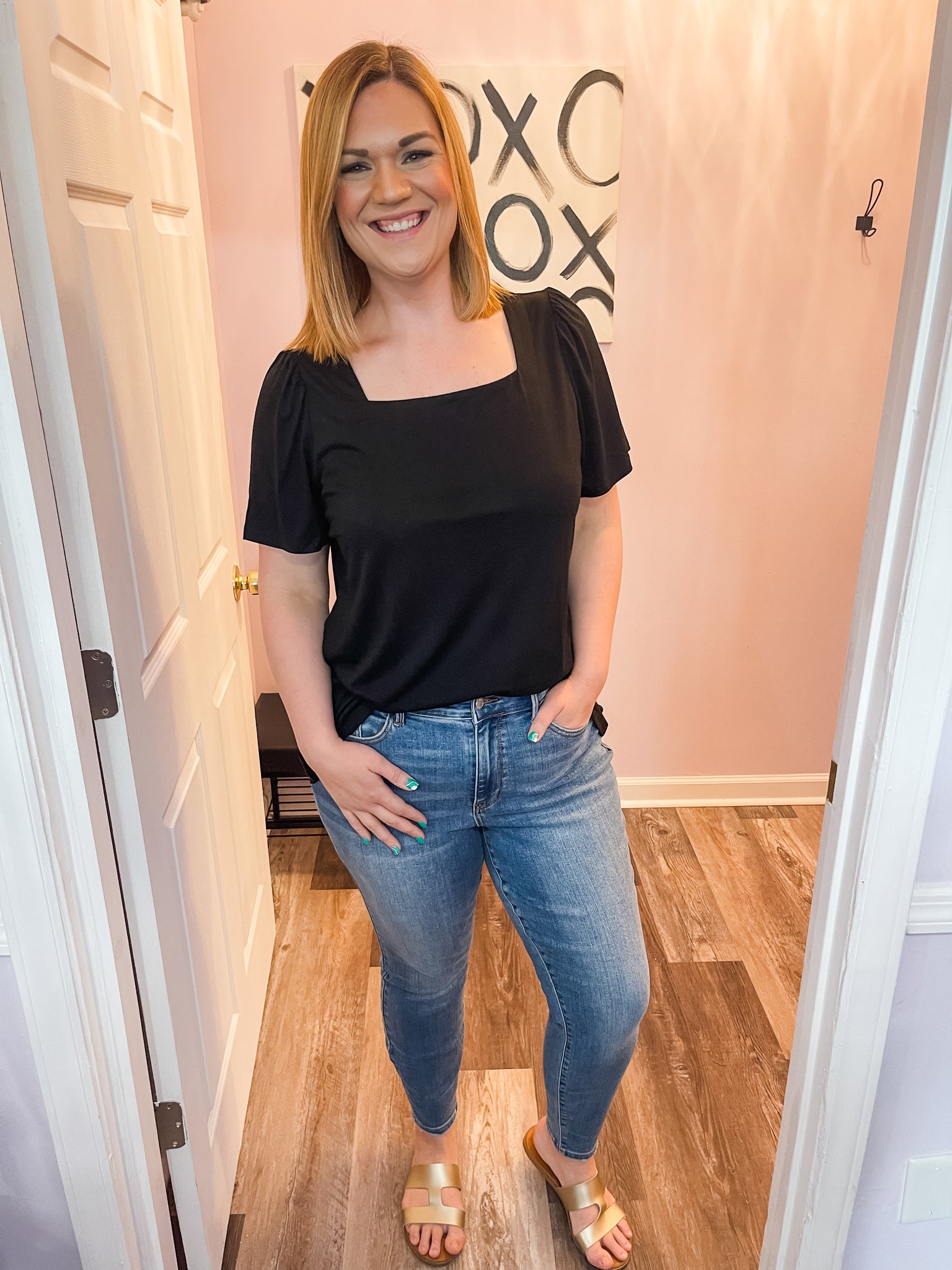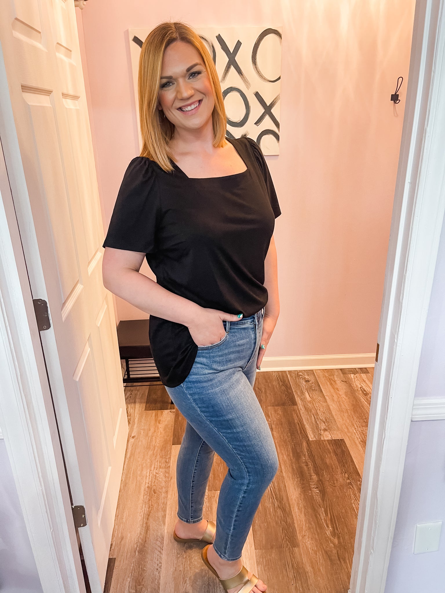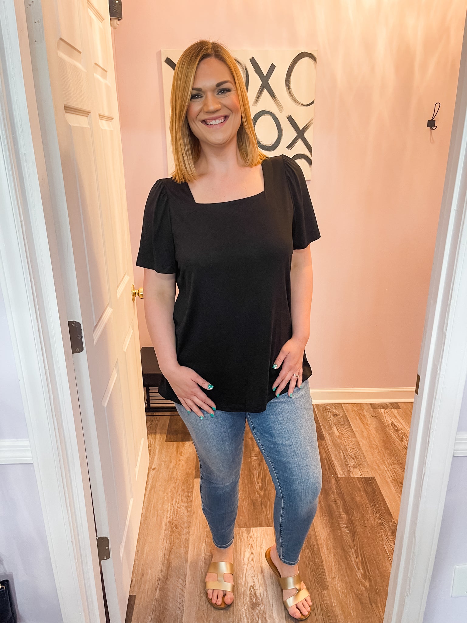 Feel cute and girly in this plus size black square neck top! Dress it up or down. Wear to work or out with friends! Good amount of stretch. True to size.