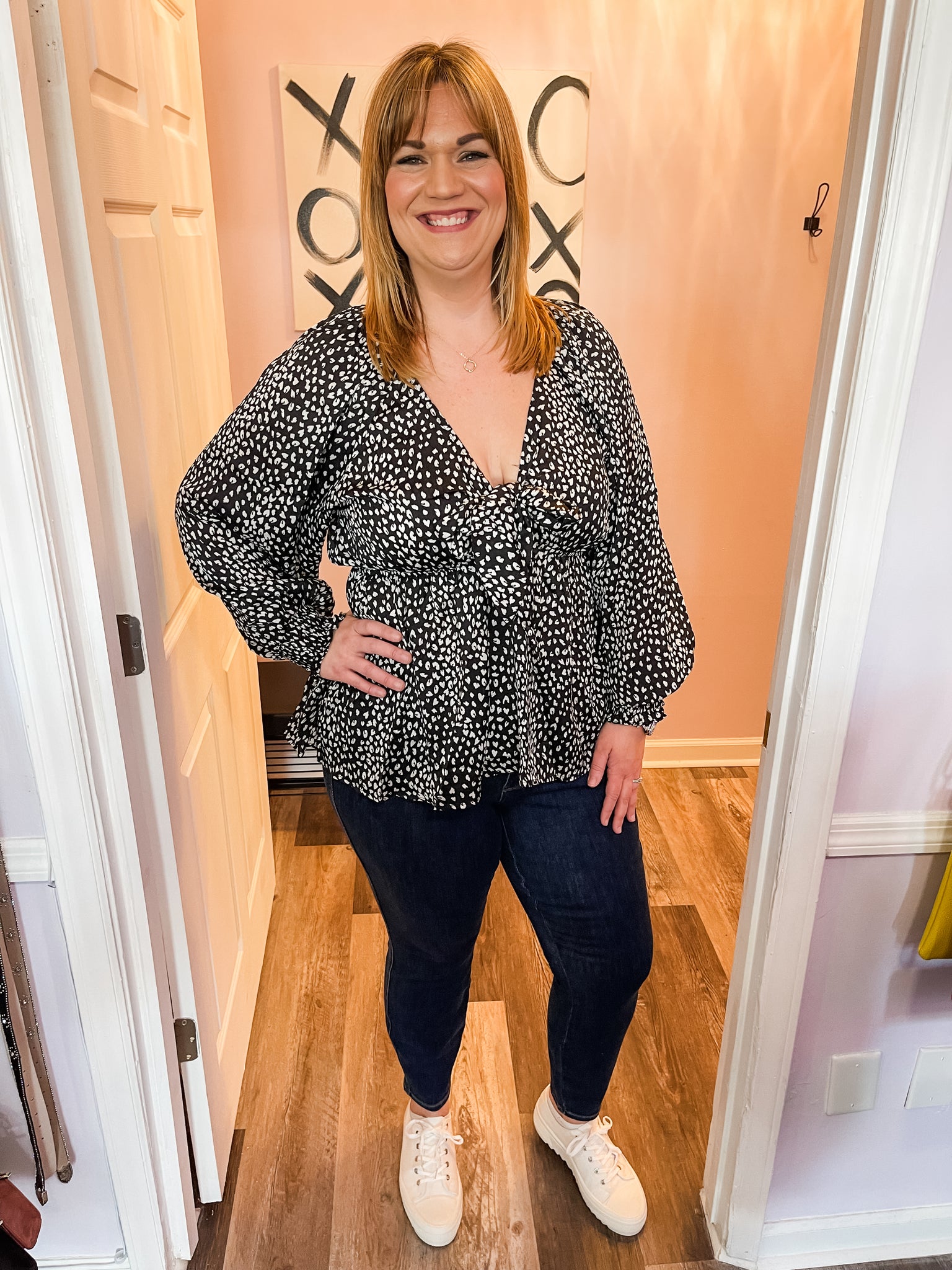 Feel cute and flirty in this black and white leopard print stretchy waist band smocked wrists long sleeve deep v neck top! Dress it up or down. Wear on a date or out with friends! Deep v neck. NO amount of stretch EXCEPT stretchy waist band, stretchy shoulder bands, and smocked wrists. Self tie front bow. True to size.