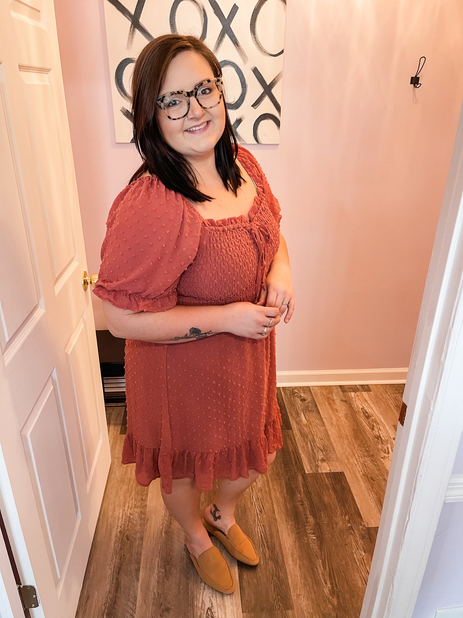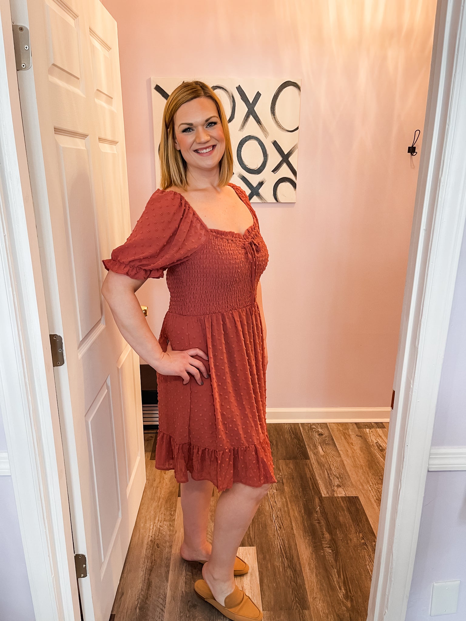 Feel cute and stylish in this plus size rust swiss dot smocked dress! Dress it up or down. Wear to work or out with friends! NO amount of stretch EXCEPT stretchy arm bands. Self tie bow in front although not a drawstring. FULLY LINED EXCEPT SLEEVES! True to size.