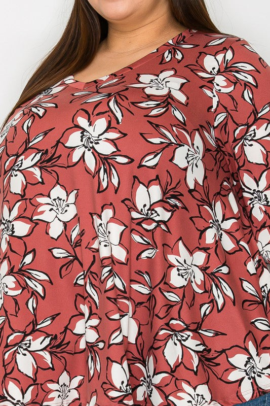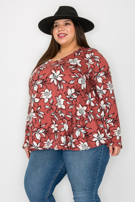 Feel girly and flirty in this plus size floral design brick colored long sleeve top. Wear to work, out with friends, on a date, etc! Good amount of stretch. True to size.