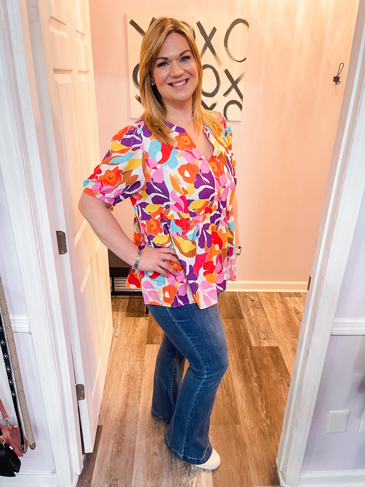 Feel cute and girly in this plus size multi-colored floral abstract top! Dress it up or down. Wear to work, out with friends, or on a date! NO amount of stretch EXCEPT for the stretchy arm bands. True to size.