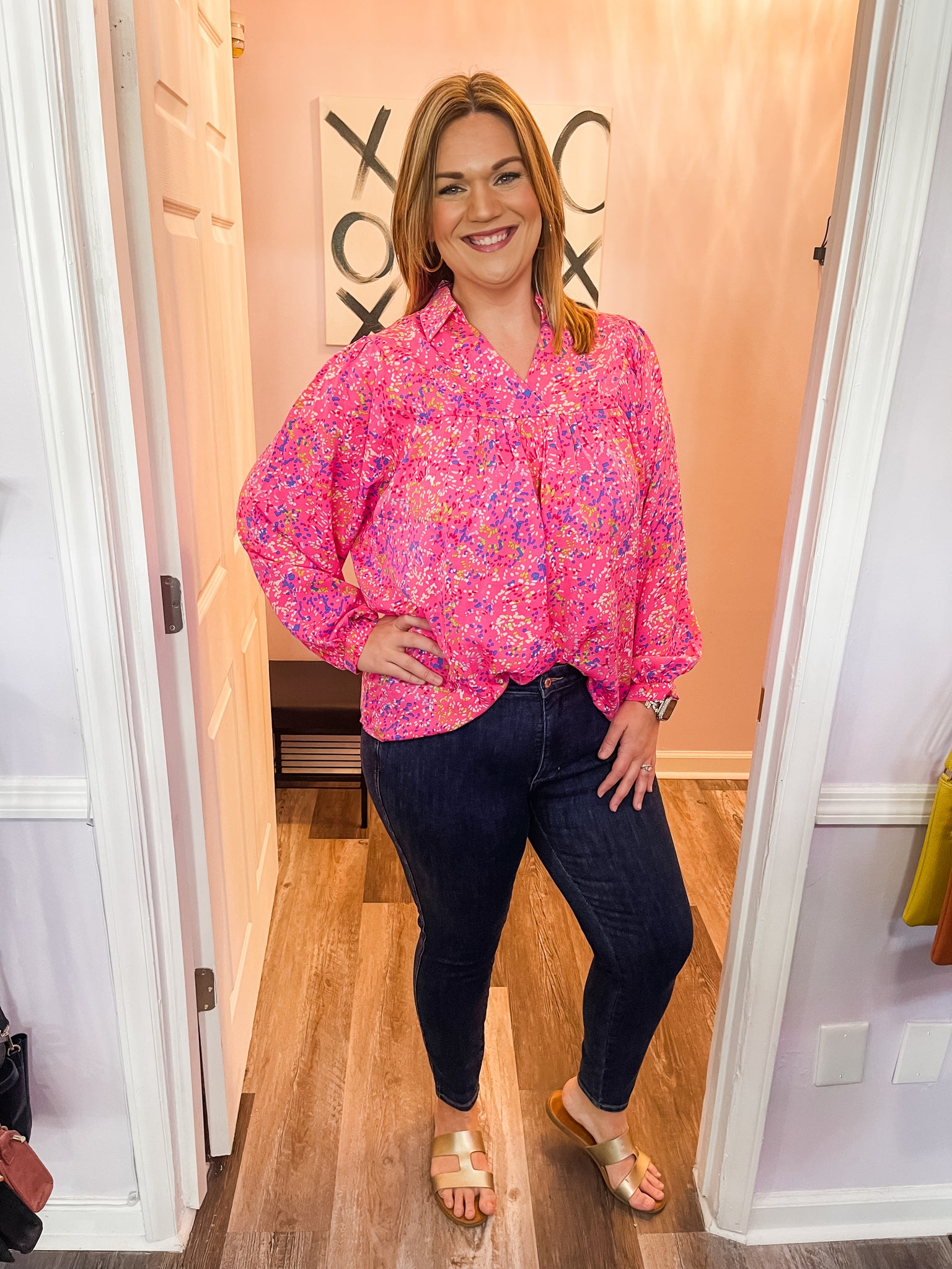 Feel cute and stylish in this plus size pink & colorful floral design v neck top. Dress it up or down. Wear to work or out with friends! NO amount of stretch. True to size.