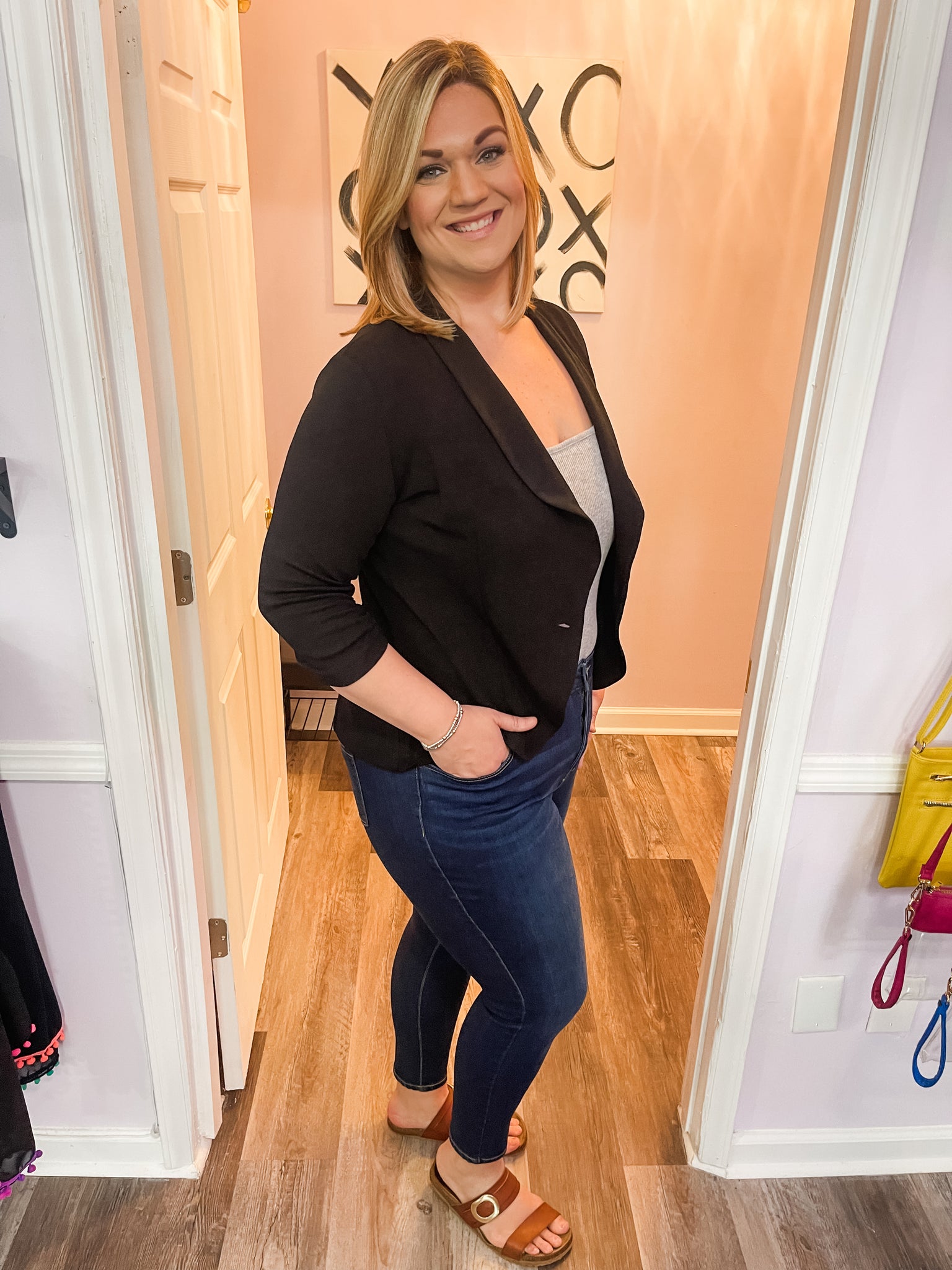Feel comfy and powerful in this plus size 3/4 length ruched sleeve THIN & LIGHTWEIGHT black knitted jersey blazer. Wear to work, out with friends, on a date, etc! Good amount of stretch. Self button in the front. True to size.