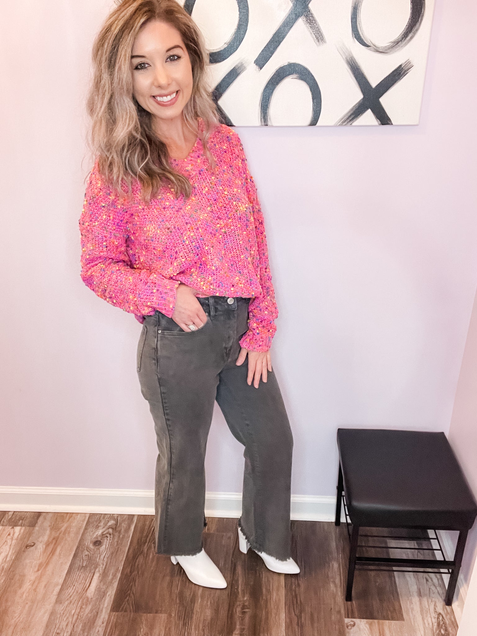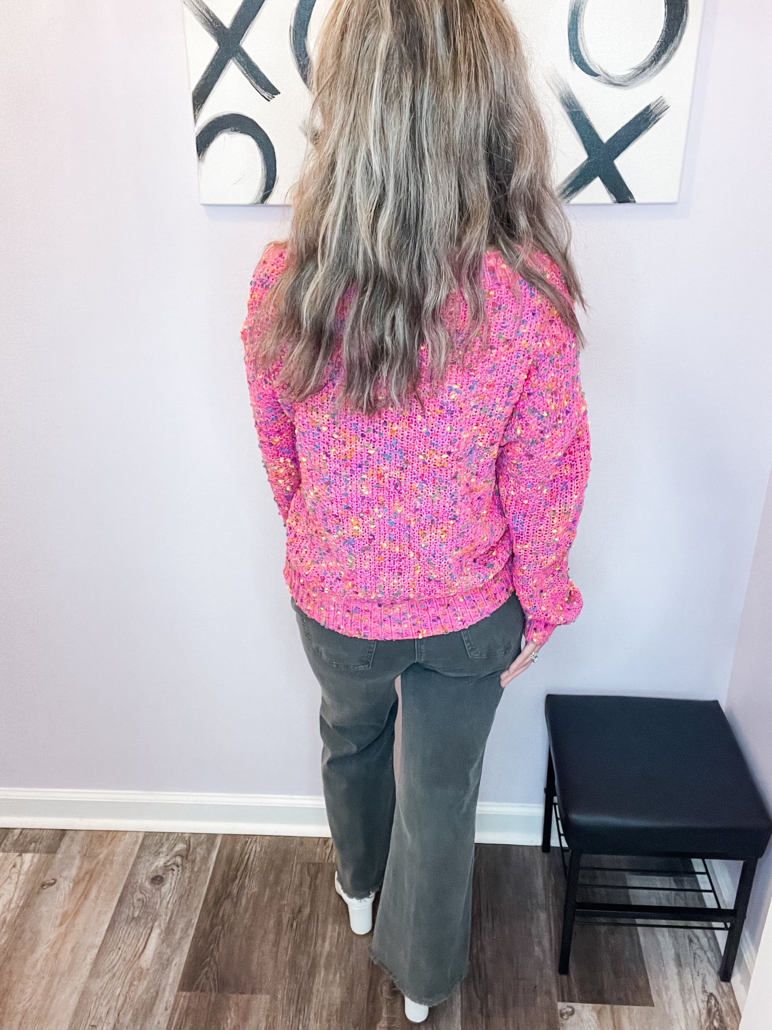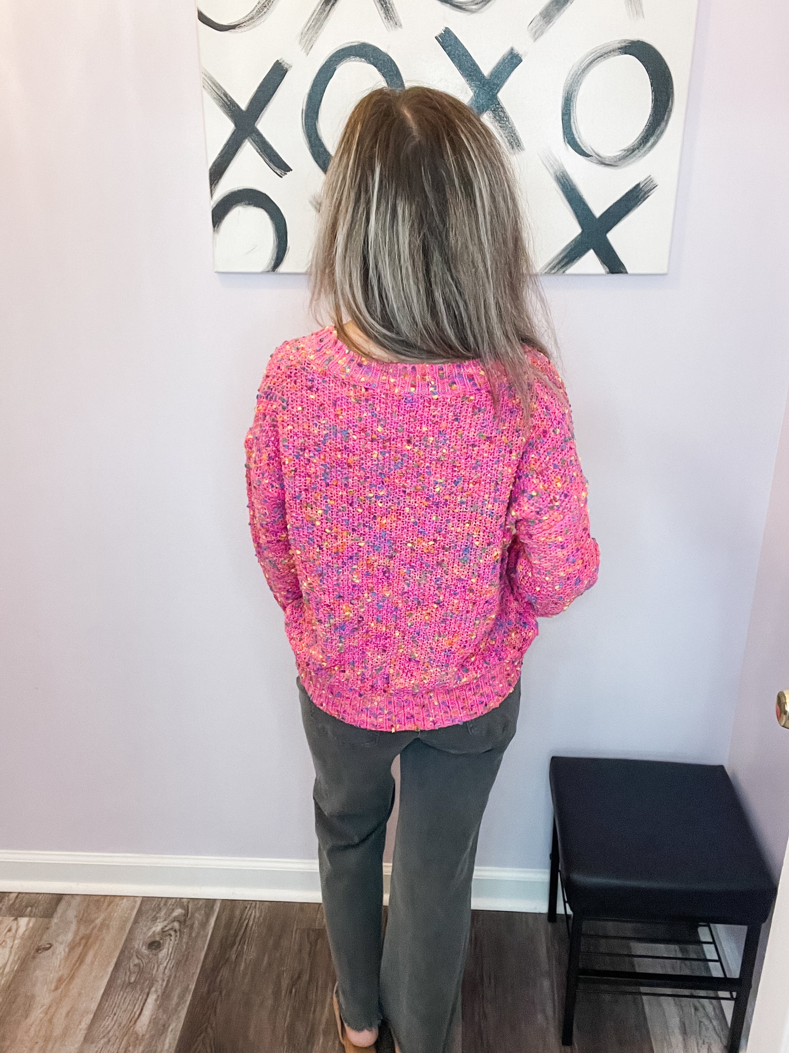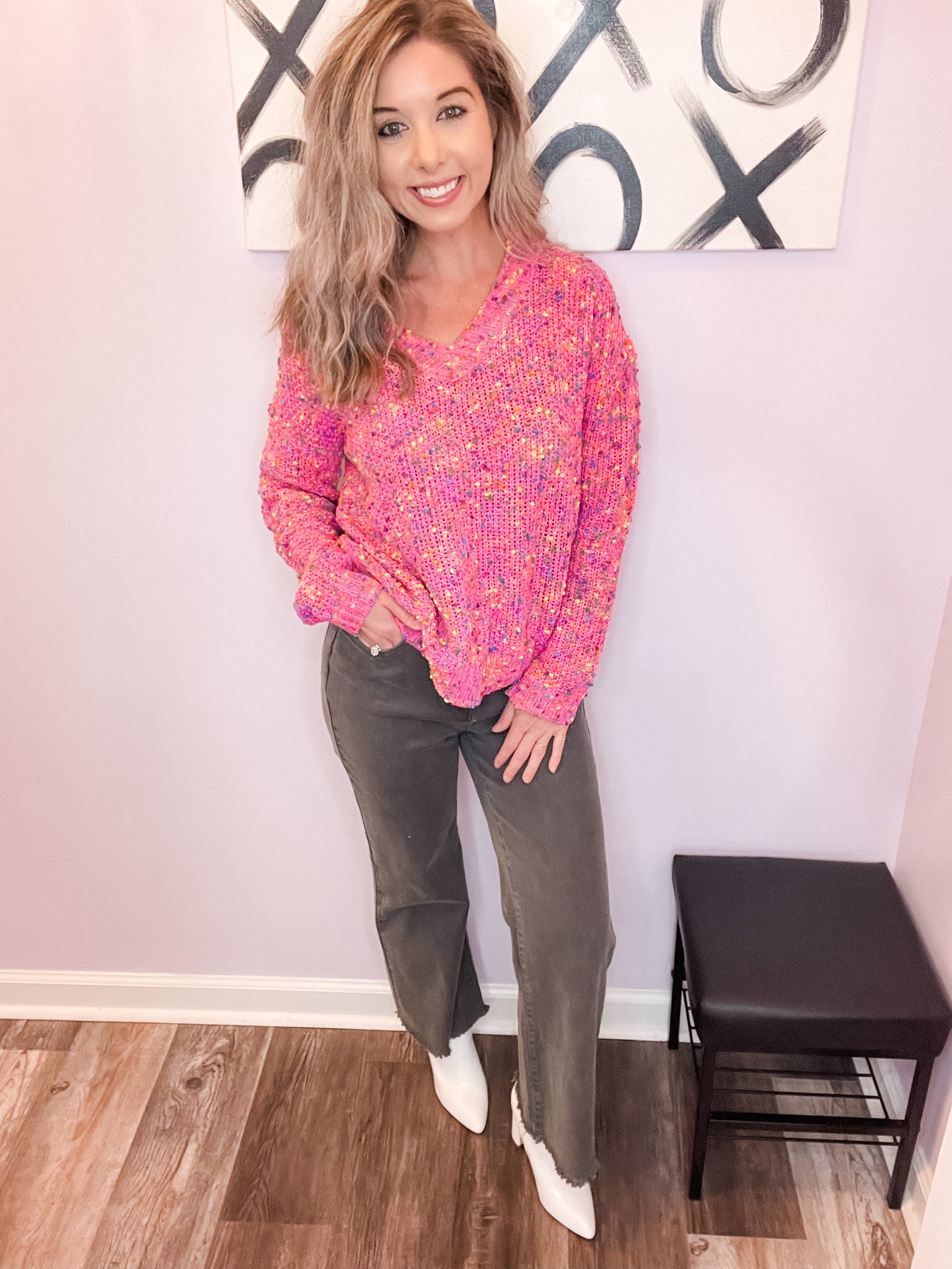 SOFT & WARM! Feel cute and comfy in this pop of color pink confetti sweater! Wear to work or out with friends! Good amount of stretch. True to size.