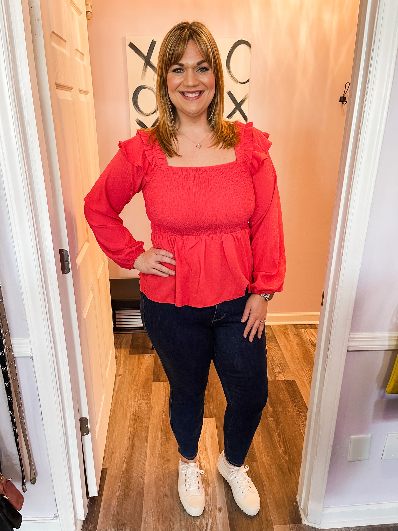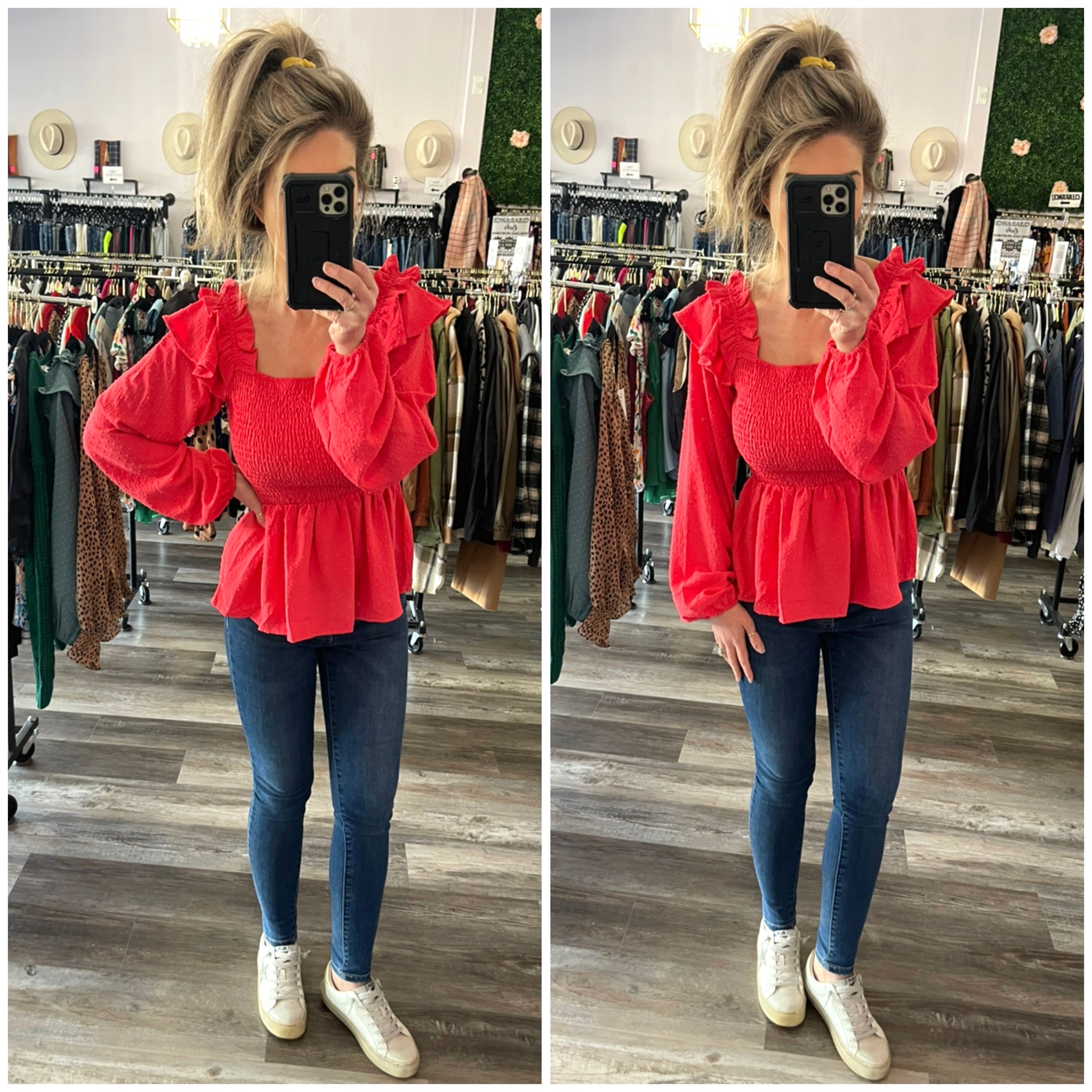 Feel flirty and girly in this red swiss dot smocked ruffled long sleeve top! Dress it up or down. Wear to work or out with friends! No amount of stretch EXCEPT for the smocked upper half and stretchy wrist bands. True to size.