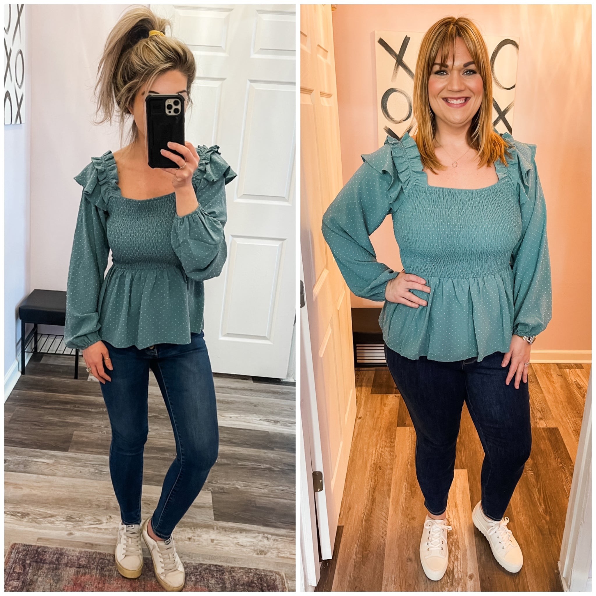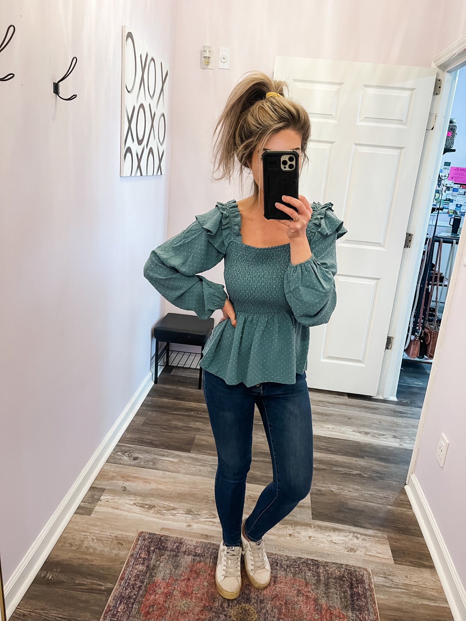 Feel flirty and girly in this sea blue swiss dot smocked ruffled long sleeve top! Dress it up or down. Wear to work or out with friends! No amount of stretch EXCEPT for the smocked upper half, stretchy shoulder bands, and stretchy wrist bands. True to size.