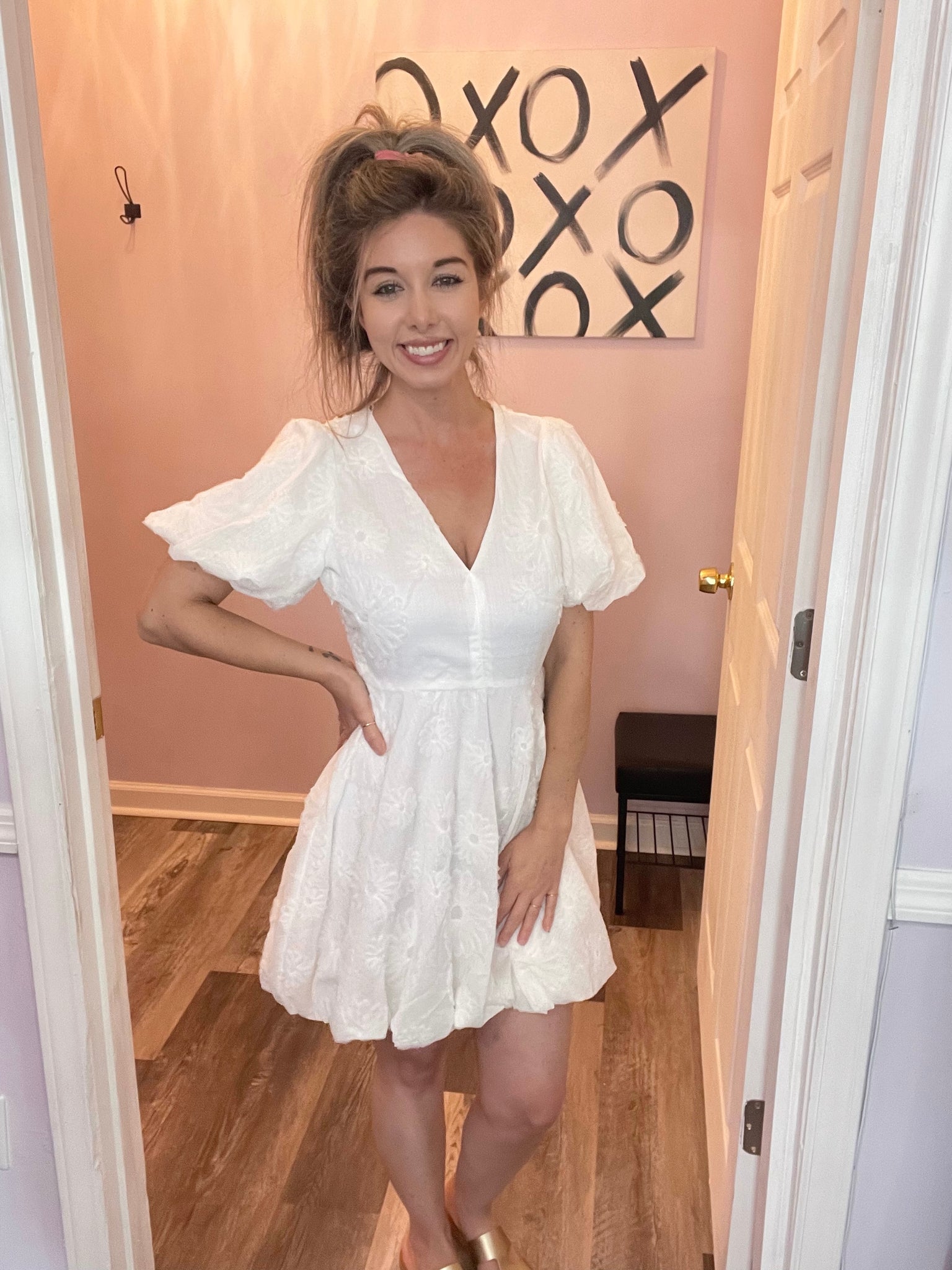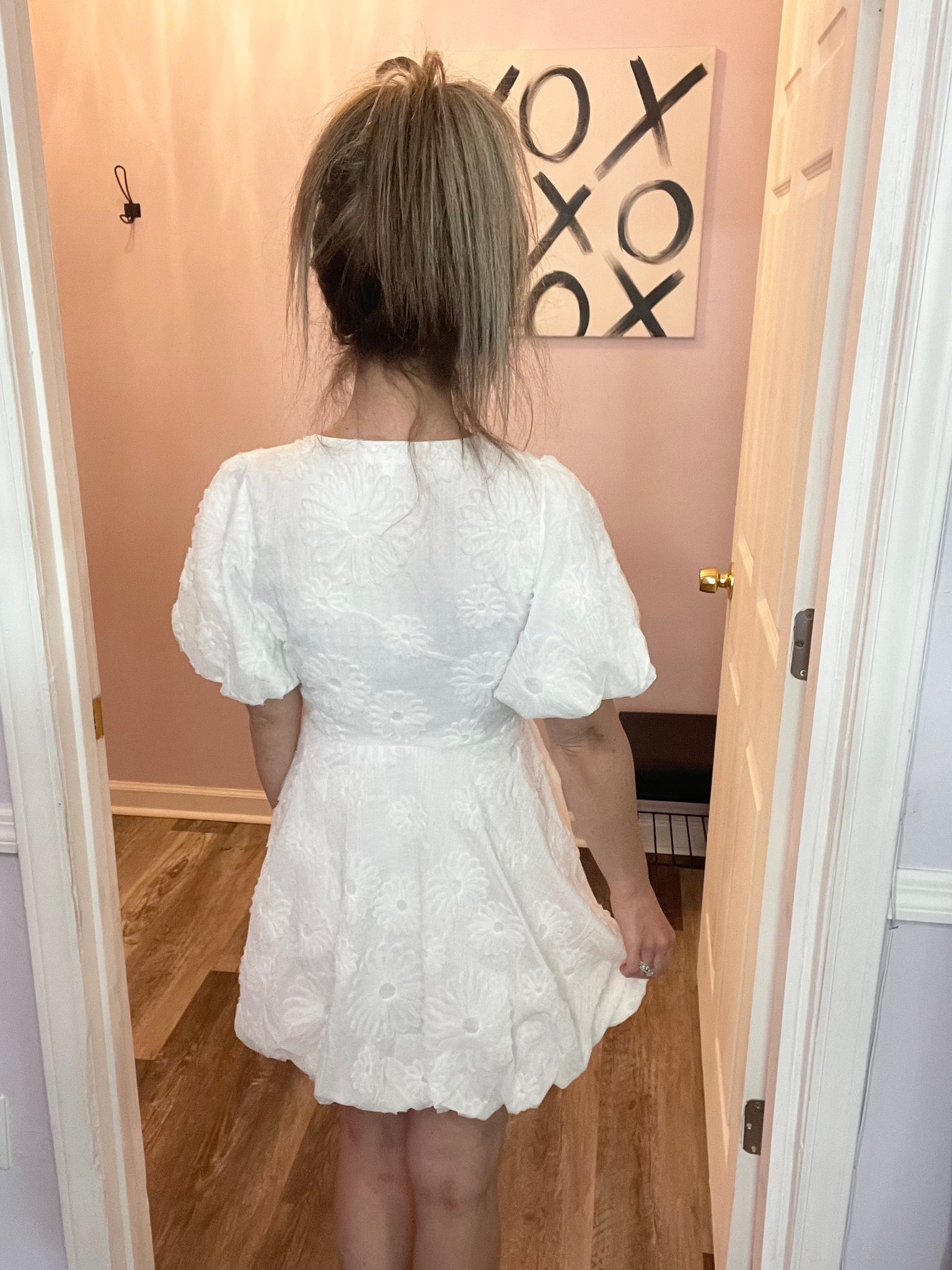 Feel cute and girly in this white floral puff sleeve dress. Wear to graduation, work, out with friends, or on a date! NO amount of stretch. True to size.