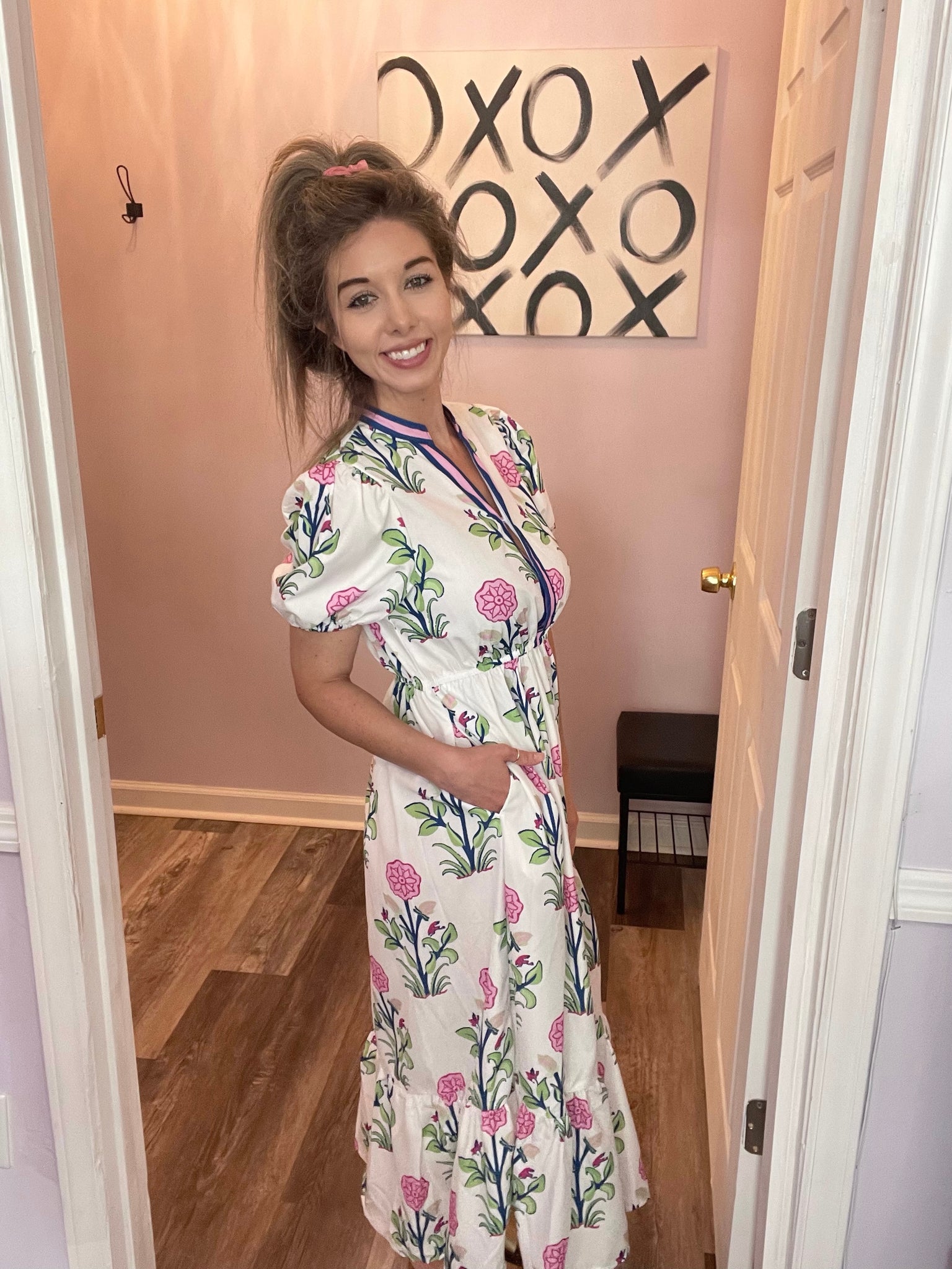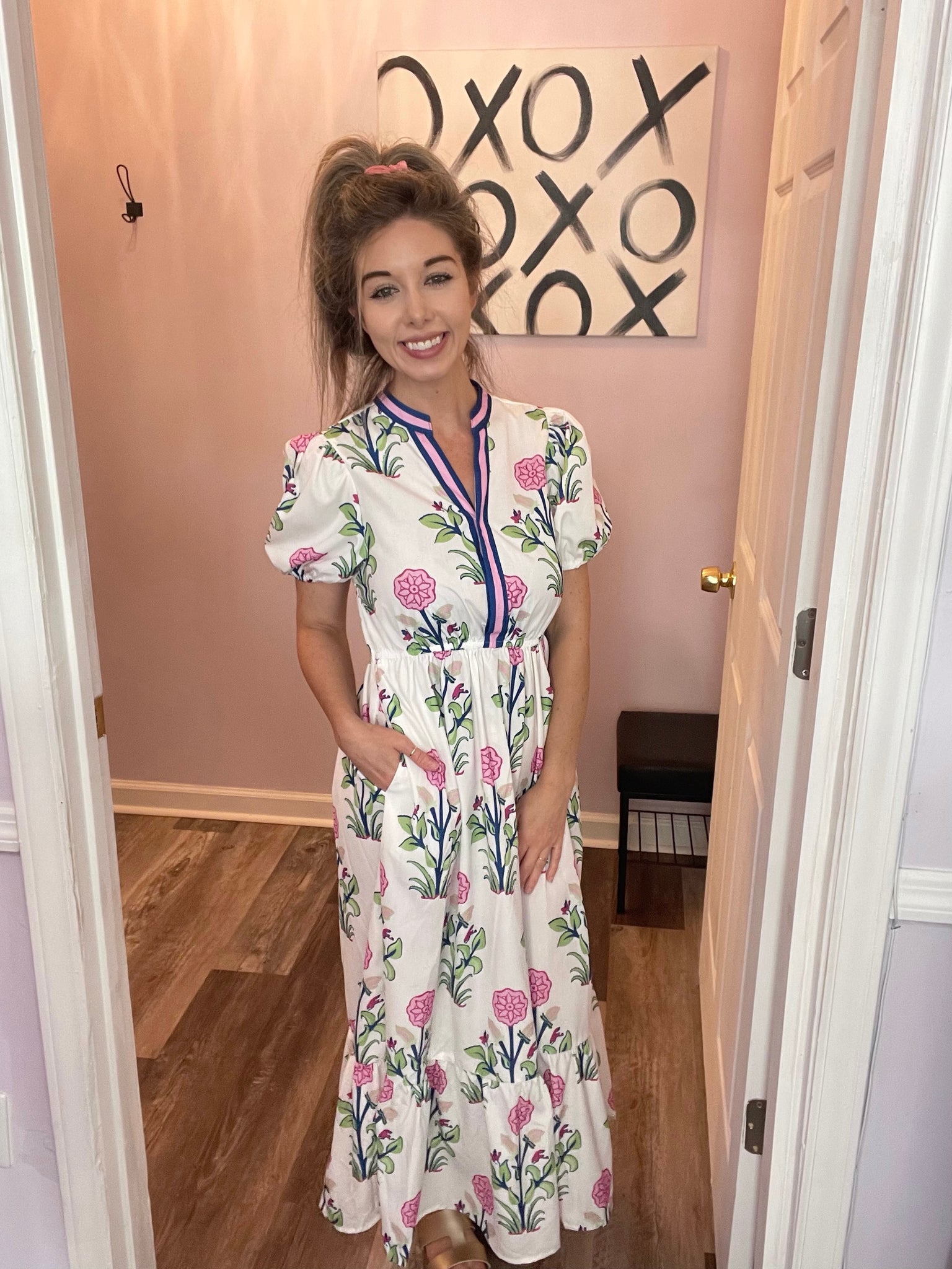 Feel cute and girly in this white multi-colored floral design with pink & blue v neckline trim maxi dress! Dress it up or down. Wear to work, out with friends, or on a date! No amount of stretch. True to size.