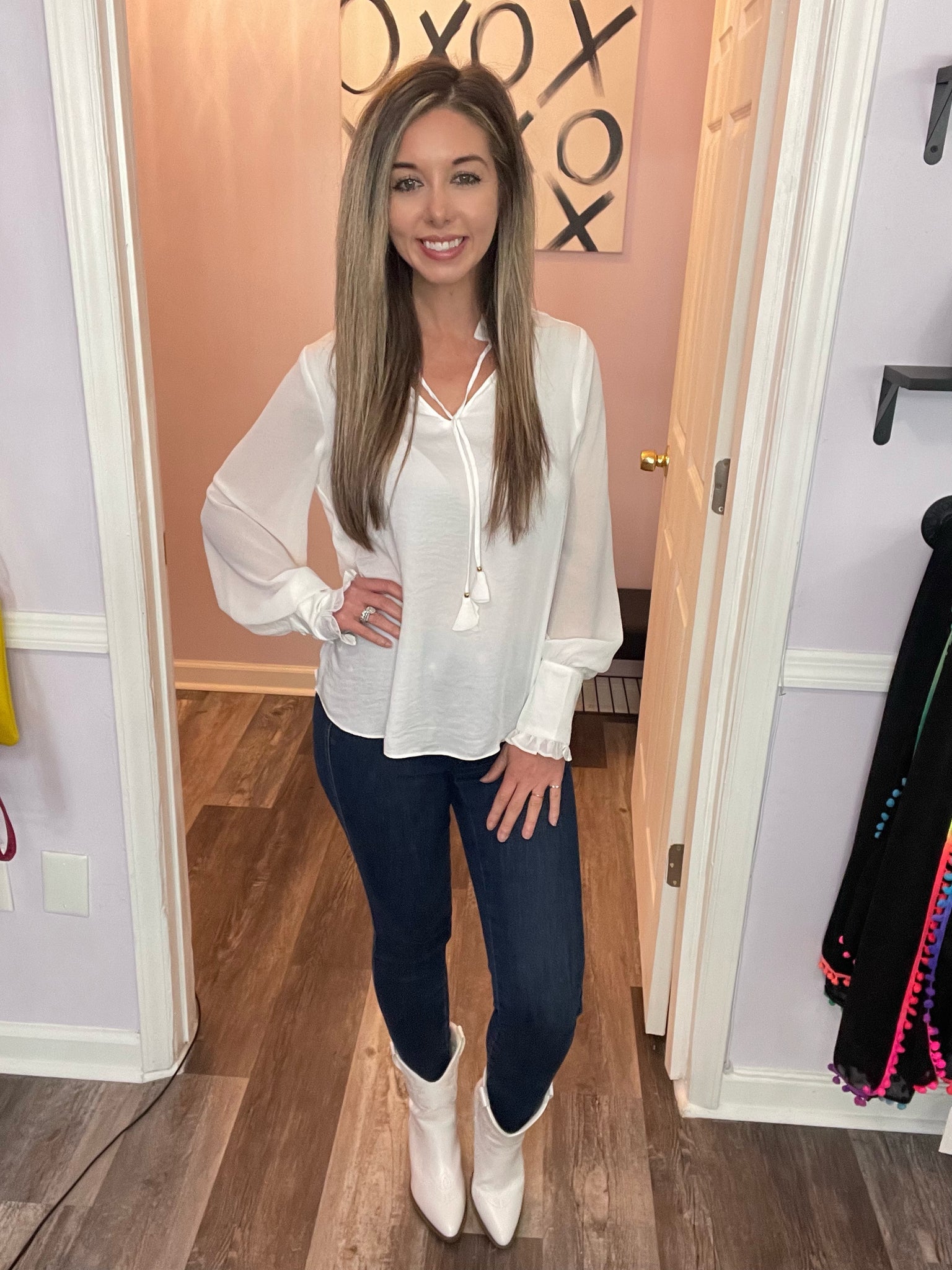 Feel cute and classy in this white tassel sheer long sleeve top. Wear to work, out with friends, on a date, etc! NO amount of stretch. True to size.